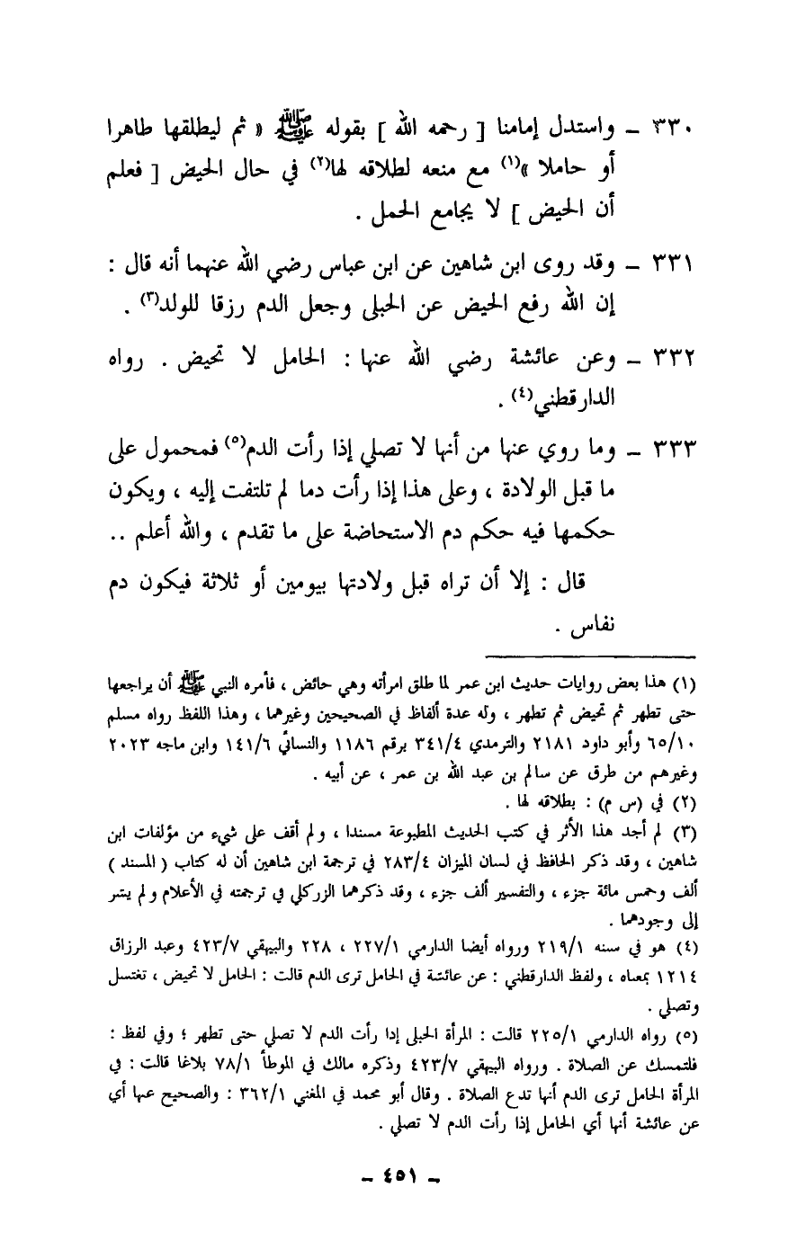 330 - واستدل إمامنا [- رَحِمَهُ اللَّهُ -] بقوله - صَلَّى اللَّهُ عَلَيْهِ وَسَلَّمَ -: «ثم ليطلقها طاهرا أو حاملا» مع منعه لطلاقه لها في حال الحيض [فعلم أن الحيض] لا يجامع الحمل.