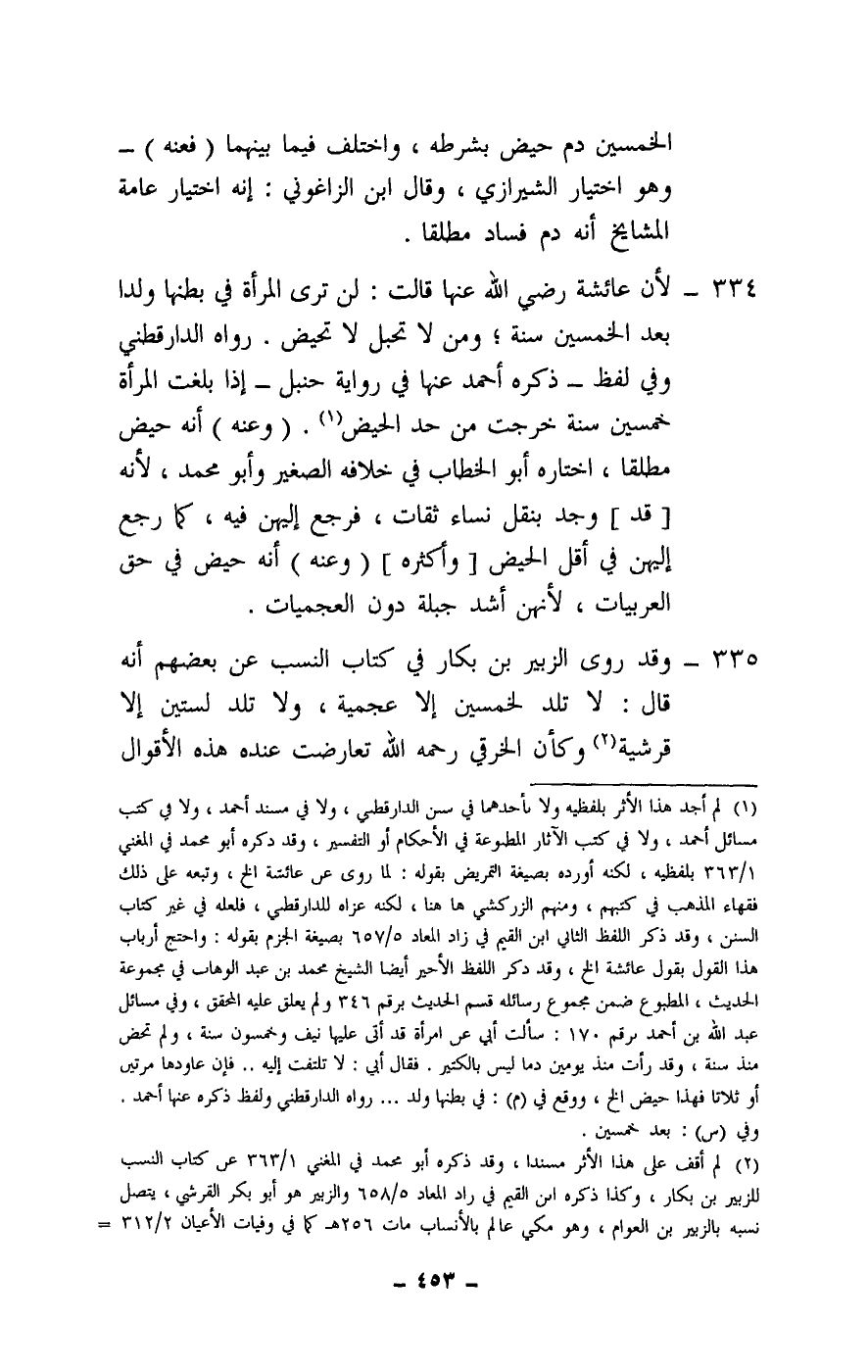 335 - وقد روى الزبير بن بكار في كتاب النسب عن بعضهم أنه قال: لا تلد لخمسين إلا عجمية، ولا تلد لستين إلا قرشية وكأن الخرقي - رَحِمَهُ اللَّهُ - تعارضت عنده هذه الأقوال