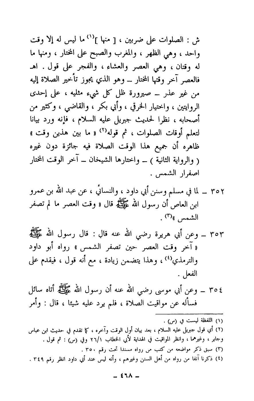 352 - لما في مسلم وسنن أبي داود، والنسائي، عن عبد الله بن عمرو بن العاص، أن رسول الله - صَلَّى اللَّهُ عَلَيْهِ وَسَلَّمَ - قال: «وقت العصر ما لم تصفر الشمس» » .