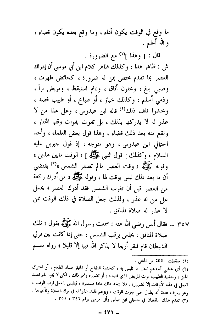 ش: ظاهر هذا، وكذلك ظاهر كلام ابن أبي موسى: أن إدراك العصر بما تقدم مختص بمن له ضرورة؛ كحائض طهرت، وصبي بلغ، ومجنون أفاق، ونائم استيقظ، ومريض برأ، وذمي أسلم، وكذلك خباز، أو طباخ، أو طبيب فصد، وخشوا تلف ذلك، قاله ابن عبدوس، وعلى هذا من لا عذر له لا يدركها بذلك، بل تفوت بفوات وقتها المختار، وتقع منه بعد ذلك قضاء، وهذا قول بعض العلماء، وأحد احتمالي ابن عبدوس، وهو متوجه، إذ قول جبريل - عَلَيْهِ السَّلَامُ - وكذلك قول النبي - صَلَّى اللَّهُ عَلَيْهِ وَسَلَّمَ -: «الوقت ما بين هذين» . وقوله - صَلَّى اللَّهُ عَلَيْهِ وَسَلَّمَ -: «وقت العصر ما لم تصفر الشمس» يقتضي أن ما بعد ذلك ليس بوقت لها، وقوله - صَلَّى اللَّهُ عَلَيْهِ وَسَلَّمَ -: «من أدرك ركعة من العصر قبل أن تغرب الشمس؛ فقد أدرك العصر» يحمل على من له عذر، ولذلك جعل الصلاة في ذلك الوقت - ممن لا عذر له - صلاة المنافق.