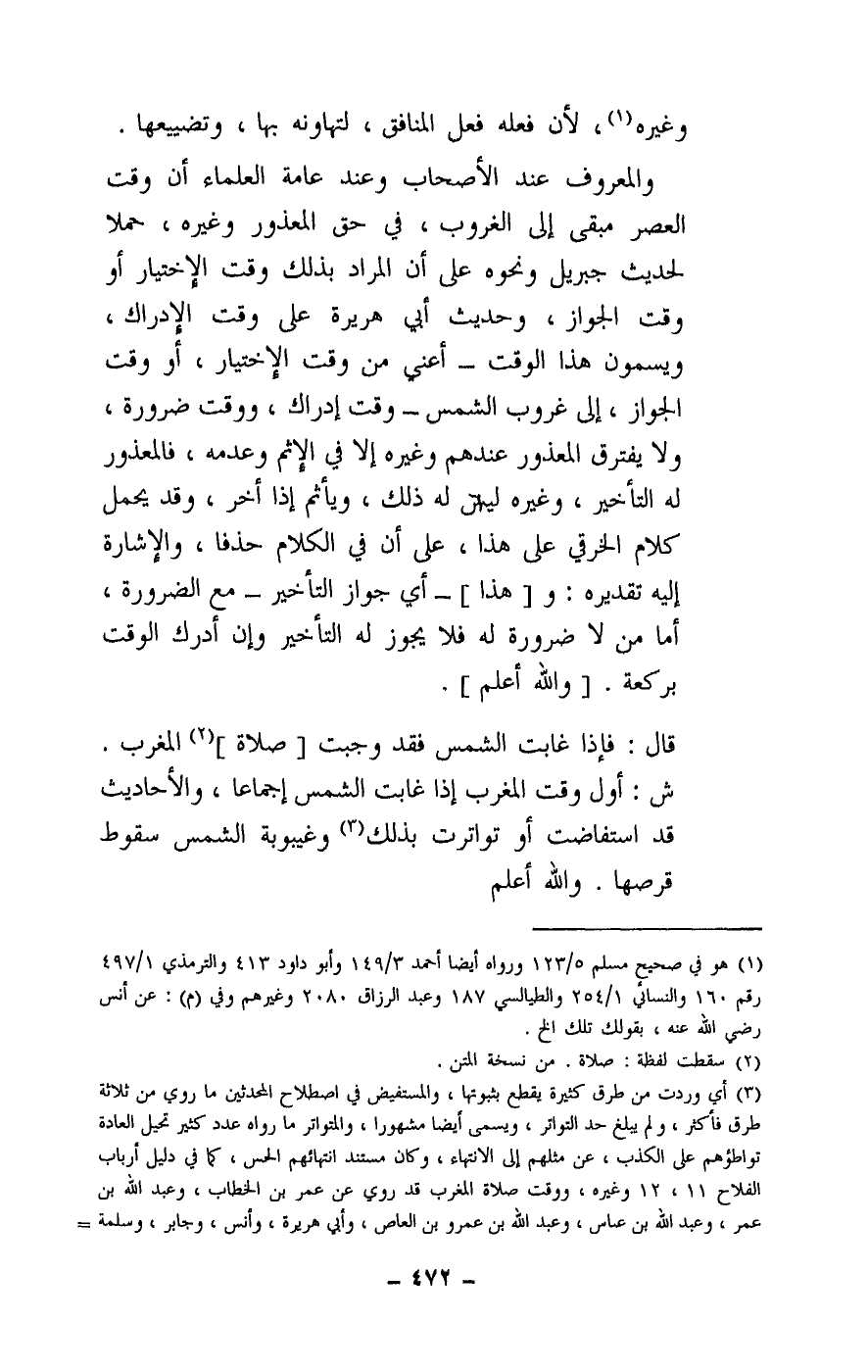 ش: أول وقت المغرب إذا غابت الشمس إجماعا، والأحاديث قد استفاضت أو تواترت بذلك، وغيبوبة الشمس: سقوط قرصها. والله أعلم.