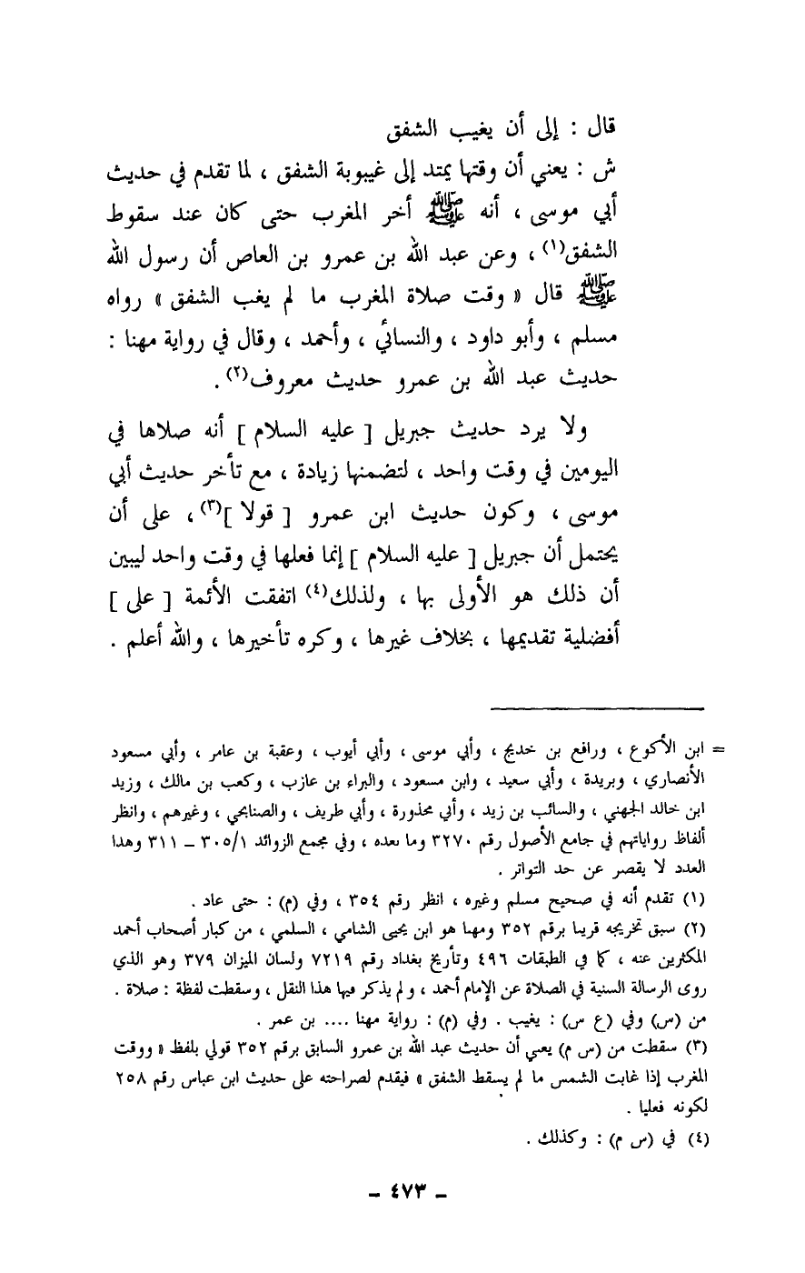 ش: يعني أن وقتها يمتد إلى غيبوبة الشفق، لما تقدم في حديث أبي موسى، «أنه - صَلَّى اللَّهُ عَلَيْهِ وَسَلَّمَ - أخر المغرب حتى كان عند سقوط الشفق» ، وعن عبد الله بن عمرو بن العاص أن رسول الله - صَلَّى اللَّهُ عَلَيْهِ وَسَلَّمَ - قال: «وقت صلاة المغرب ما لم يغب الشفق» . رواه مسلم، وأبو داود، والنسائي، وأحمد، وقال في رواية مهنا: حديث عبد الله بن عمرو حديث معروف.