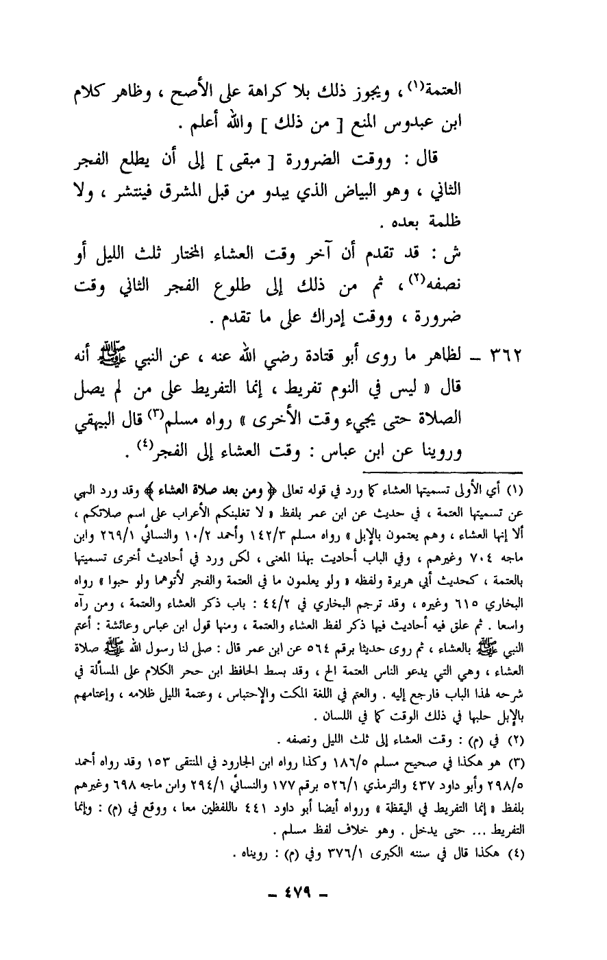 362 - لظاهر ما روى أبو قتادة - رَضِيَ اللَّهُ عَنْهُ - عن النبي - صَلَّى اللَّهُ عَلَيْهِ وَسَلَّمَ - أنه قال: «ليس في النوم تفريط، إنما التفريط على من لم يصل الصلاة حتى يجيء وقت الأخرى» . رواه مسلم، قال البيهقي: وروينا عن ابن عباس: وقت العشاء إلى الفجر.