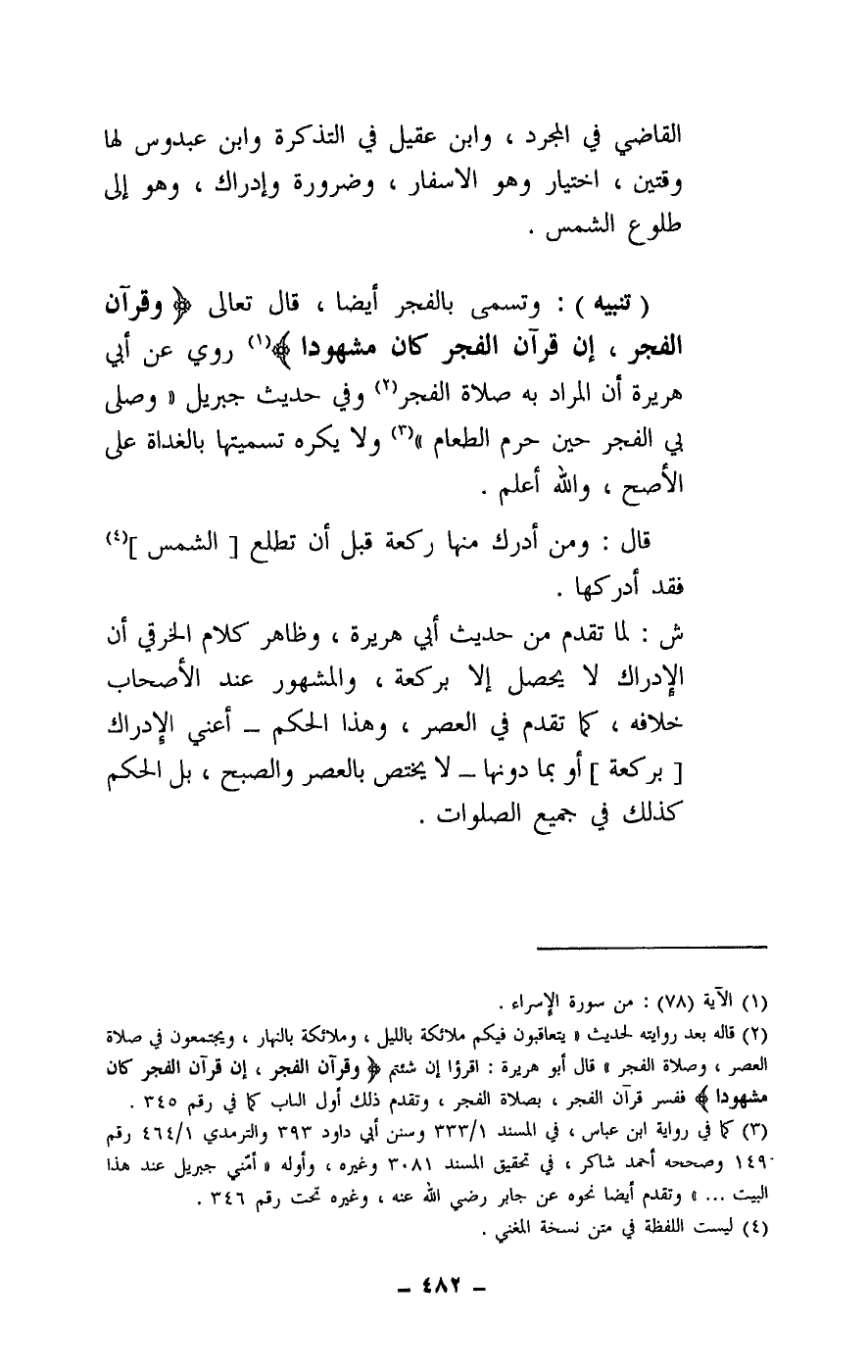 (تنبيه) : وتسمى بالفجر أيضا، قال تعالى: {وَقُرْآنَ الْفَجْرِ إِنَّ قُرْآنَ الْفَجْرِ كَانَ مَشْهُودًا} [الإسراء: 78] روي عن أبي هريرة أن المراد به صلاة الفجر، وفي حديث جبريل: «وصلى بي الفجر حين حرم الطعام» ولا يكره تسميتها بالغداة على الأصح، والله أعلم.