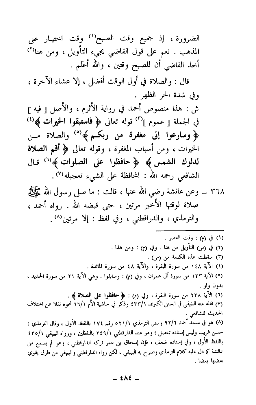 368 - وعن عائشة - رَضِيَ اللَّهُ عَنْهَا -، قالت: «ما صلى رسول الله - صَلَّى اللَّهُ عَلَيْهِ وَسَلَّمَ - صلاة لوقتها الأخير مرتين، حتى قبضه الله» . رواه أحمد، والترمذي، والدارقطني، وفي لفظ: إلا مرتين.