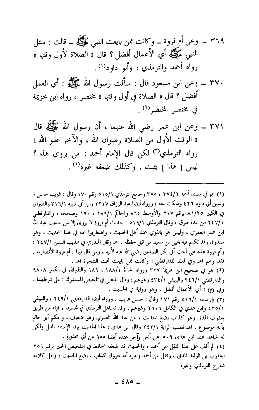 371 - وعن ابن عمر - رَضِيَ اللَّهُ عَنْهُمَا -، أن رسول الله - صَلَّى اللَّهُ عَلَيْهِ وَسَلَّمَ - قال: «الوقت الأول من الصلاة رضوان الله، والآخر عفو الله» رواه الترمذي، لكن قال الإمام أحمد: من يروي هذا؟ ليس [هذا] يثبت. وكذلك ضعفه غيره.