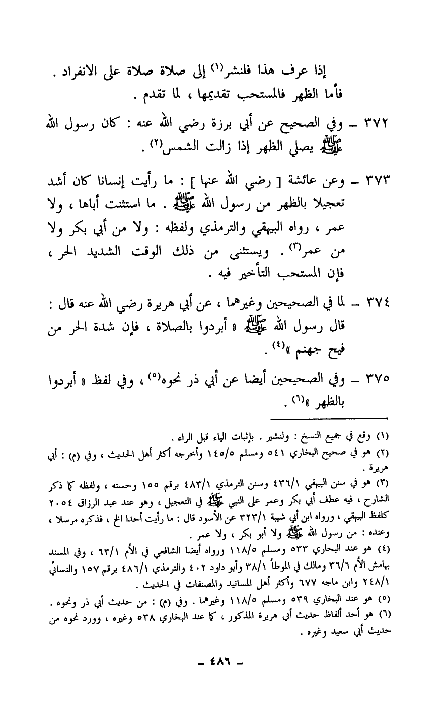 373 - «وعن عائشة [- رَضِيَ اللَّهُ عَنْهَا -] : ما رأيت إنسانا كان أشد تعجيلا بالظهر من رسول الله - صَلَّى اللَّهُ عَلَيْهِ وَسَلَّمَ -. ما استثنت أباها. ولا عمر» ، رواه البيهقي والترمذي ولفظه: ولا من أبي بكر، ولا من عمر. ويستثنى من ذلك الوقت الشديد الحر، فإن المستحب التأخير فيه.