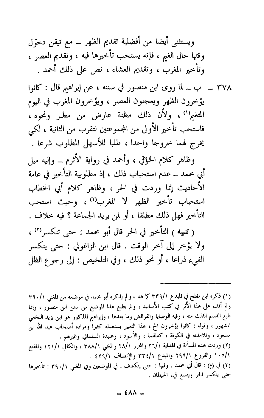 (تنبيه) : التأخير في الحر قال أبو محمد: حتى تنكسر، ولا يؤخر إلى آخر الوقت. قال ابن الزاغوني: حتى ينكسر الفيء ذراعا، أو نحو ذلك، وفي التلخيص: إلى رجوع الظل