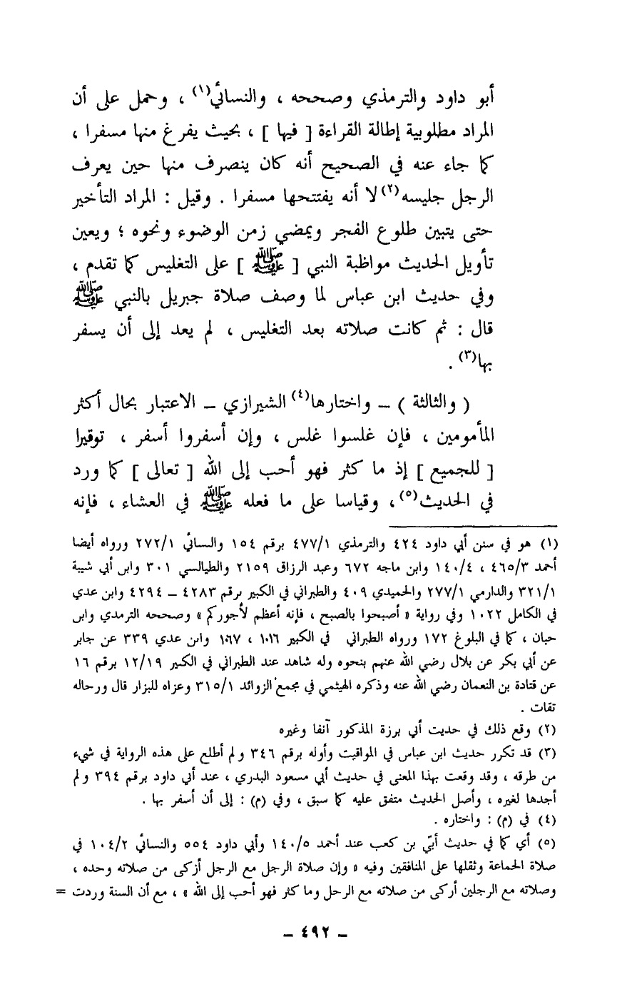 أبو داود والترمذي وصححه، والنسائي، وحمل على أن المراد مطلوبية إطالة القراءة [فيها] ، بحيث يفرغ منها مسفرا، كما جاء عنه في الصحيح أنه كان ينصرف منها حين يعرف الرجل جليسه، لا أنه يفتتحها مسفرا. وقيل: المراد التأخير حتى يتبين طلوع الفجر ويمضي زمن الوضوء ونحوه؛ ويعين تأويل الحديث مواظبة النبي - صَلَّى اللَّهُ عَلَيْهِ وَسَلَّمَ - على التغليس كما تقدم، وفي حديث ابن عباس لما وصف صلاة جبريل بالنبي - صَلَّى اللَّهُ عَلَيْهِ وَسَلَّمَ - قال: ثم كانت صلاته بعد التغليس، لم يعد إلى أن يسفر بها.