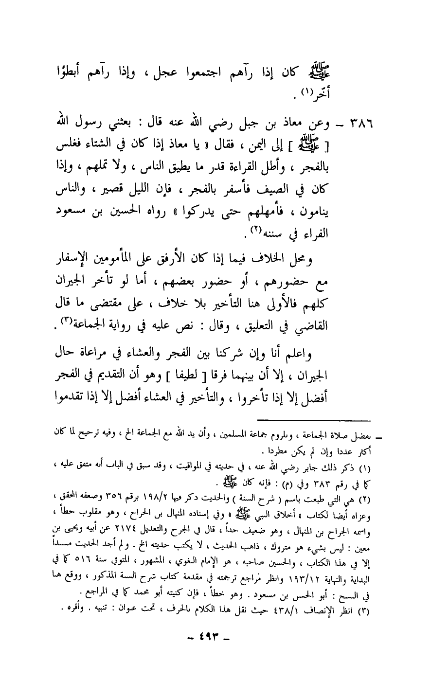 386 - «وعن معاذ بن جبل - رَضِيَ اللَّهُ عَنْهُ - قال: بعثني رسول الله - صَلَّى اللَّهُ عَلَيْهِ وَسَلَّمَ - إلى اليمن، فقال: «يا معاذ إذا كان في الشتاء فغلس بالفجر، وأطل القراءة قدر ما يطيق الناس، ولا تملهم، وإذا كان في الصيف فأسفر بالفجر، فإن الليل قصير، والناس ينامون، فأمهلهم حتى يدركوا» رواه الحسين بن مسعود الفراء في سننه.
