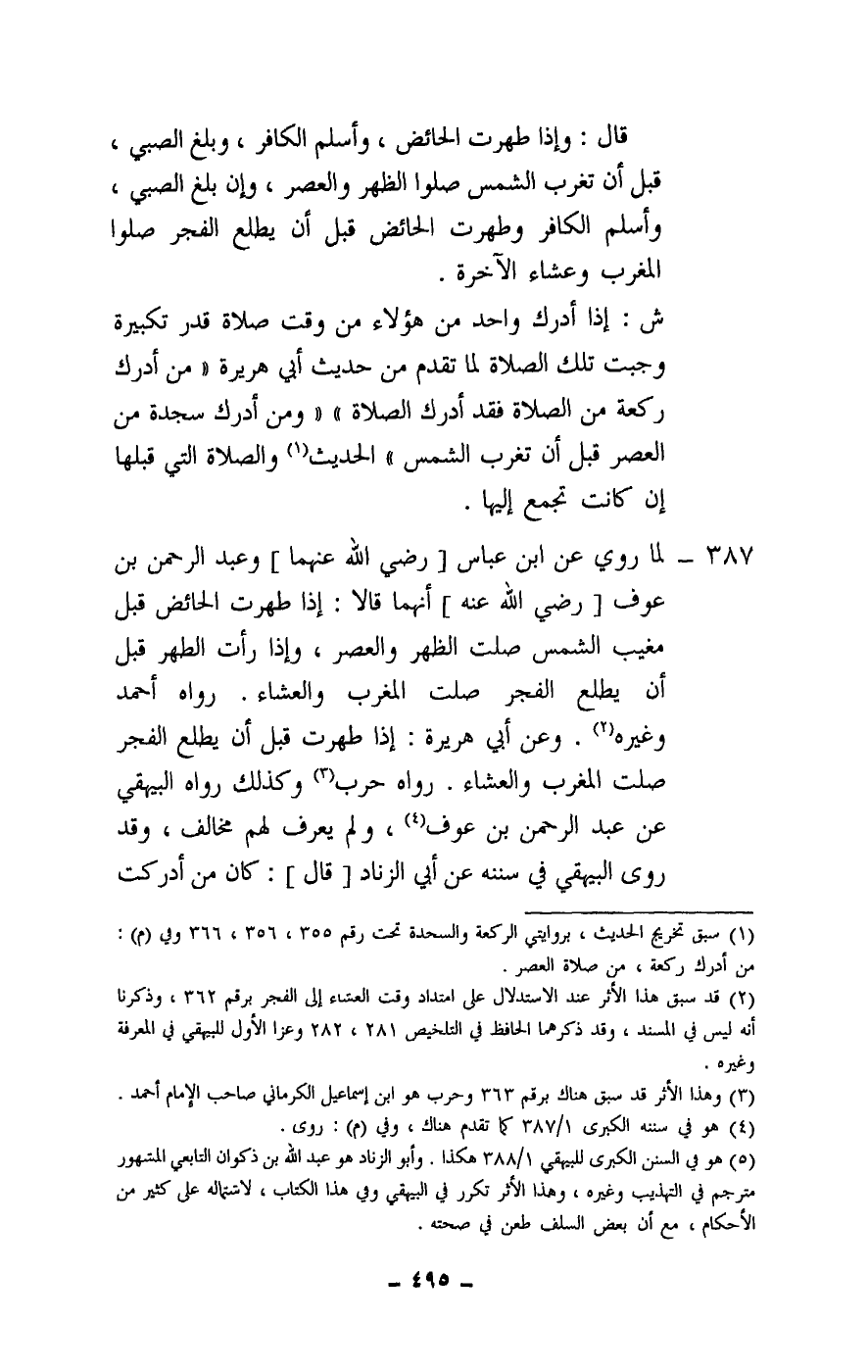 387 - لما روي عن ابن عباس [- رَضِيَ اللَّهُ عَنْهُمَا -] ، وعبد الرحمن بن عوف [- رَضِيَ اللَّهُ عَنْهُ -] أنهما قالا: إذا طهرت الحائض قبل مغيب الشمس صلت الظهر والعصر، وإذا رأت الطهر قبل أن يطلع الفجر صلت المغرب والعشاء. رواه أحمد وغيره. وعن أبي هريرة: إذا طهرت قبل أن يطلع الفجر صلت المغرب والعشاء. رواه حرب، وكذلك رواه البيهقي عن عبد الرحمن بن عوف، ولم يعرف لهم مخالف، وقد روى البيهقي في سننه عن أبي الزناد [قال] : كان من أدركت