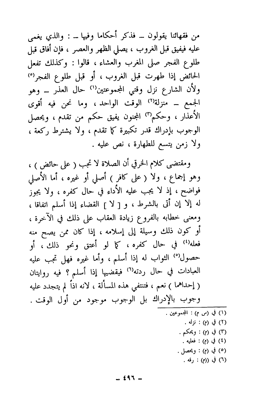 من فقهائنا يقولون - فذكر أحكاما وفيها -: والذي يغمى عليه فيفيق قبل الغروب، يصلي الظهر والعصر، فإن أفاق قبل طلوع الفجر صلى المغرب والعشاء، قالوا: وكذلك تفعل الحائض إذا طهرت قبل الغروب، أو قبل طلوع الفجر، ولأن الشارع نزل وقتي المجموعتين حال العذر - وهو الجمع - منزلة الوقت الواحد، وما نحن فيه أقوى الأعذار، وحكم المجنون يفيق حكم من تقدم، ويحصل الوجوب بإدراك قدر تكبيرة كما تقدم، ولا يشترط ركعة، ولا زمن يتسع للطهارة، نص عليه.