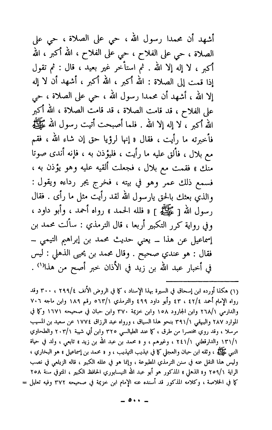 أشهد أن محمدا رسول الله، حي على الصلاة، حي على الصلاة، حي على الفلاح، حي على الفلاح، الله أكبر، الله أكبر، لا إله إلا الله. ثم استأخر غير بعيد، قال: ثم تقول إذا قمت إلى الصلاة: الله أكبر، الله أكبر، أشهد أن لا إله إلا الله، أشهد أن محمدا رسول الله، حي على الصلاة، حي على الفلاح، قد قامت الصلاة، قد قامت الصلاة، الله أكبر الله أكبر، لا إله إلا الله. فلما أصبحت أتيت رسول الله - صَلَّى اللَّهُ عَلَيْهِ وَسَلَّمَ - فأخبرته ما رأيت، فقال: «إنها لرؤيا حق إن شاء الله، فقم مع بلال، فألق عليه ما رأيت، فليؤذن به، فإنه أندى صوتا منك» . فقمت مع بلال، فجعلت ألقيه عليه وهو يؤذن به، فسمع ذلك عمر وهو في بيته، فخرج يجر رداءه، ويقول: والذي بعثك بالحق يا رسول الله، لقد رأيت مثل ما رأى. فقال رسول الله - صَلَّى اللَّهُ عَلَيْهِ وَسَلَّمَ -: «فلله الحمد» . رواه أحمد، وأبو داود.