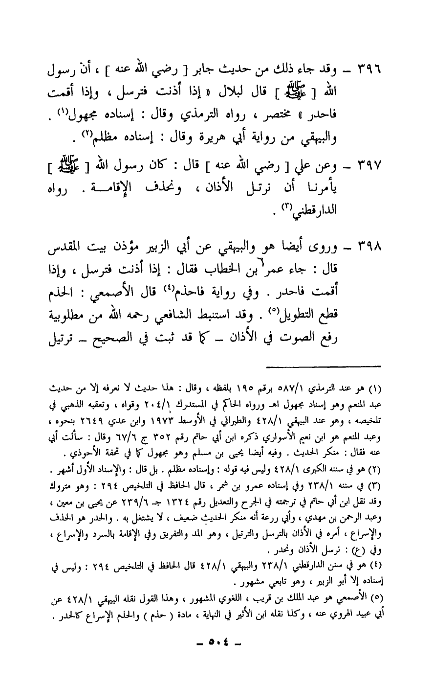 396 - وقد جاء ذلك من حديث جابر [- رَضِيَ اللَّهُ عَنْهُ -] ، «أن رسول الله - صَلَّى اللَّهُ عَلَيْهِ وَسَلَّمَ - قال لبلال: «إذا أذنت فترسل، وإذا أقمت فاحدر» مختصر، رواه الترمذي، وقال: إسناده مجهول. والبيهقي من رواية أبي هريرة، وقال: إسناده مظلم.