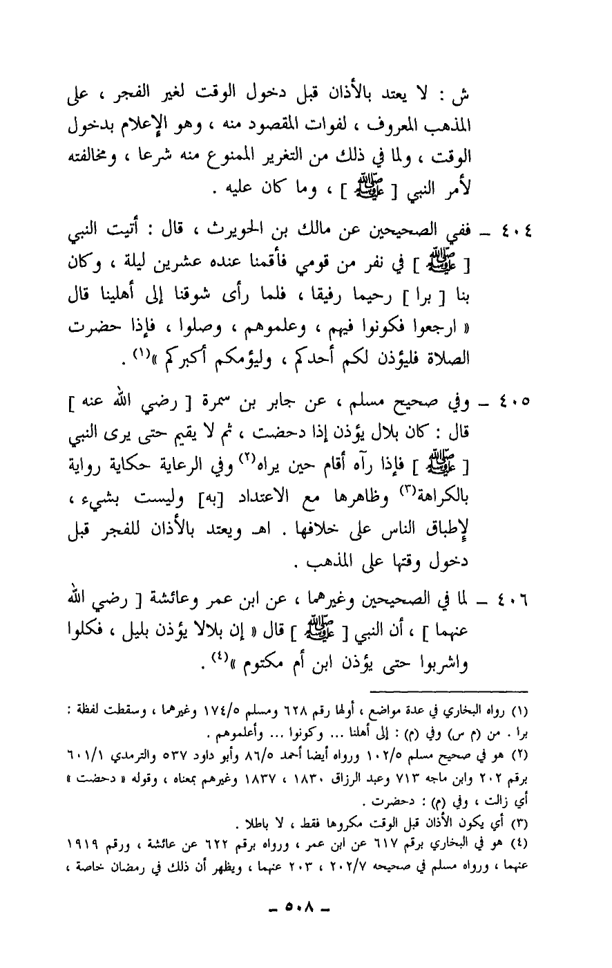 404 - ففي الصحيحين «عن مالك بن الحويرث، قال: أتيت النبي - صَلَّى اللَّهُ عَلَيْهِ وَسَلَّمَ - في نفر من قومي، فأقمنا عنده عشرين ليلة، وكان بنا [برا] رحيما رفيقا، فلما رأى شوقنا إلى أهلينا قال: «ارجعوا فكونوا فيهم، وعلموهم، وصلوا، فإذا حضرت الصلاة فليؤذن لكم أحدكم، وليؤمكم أكبركم» .