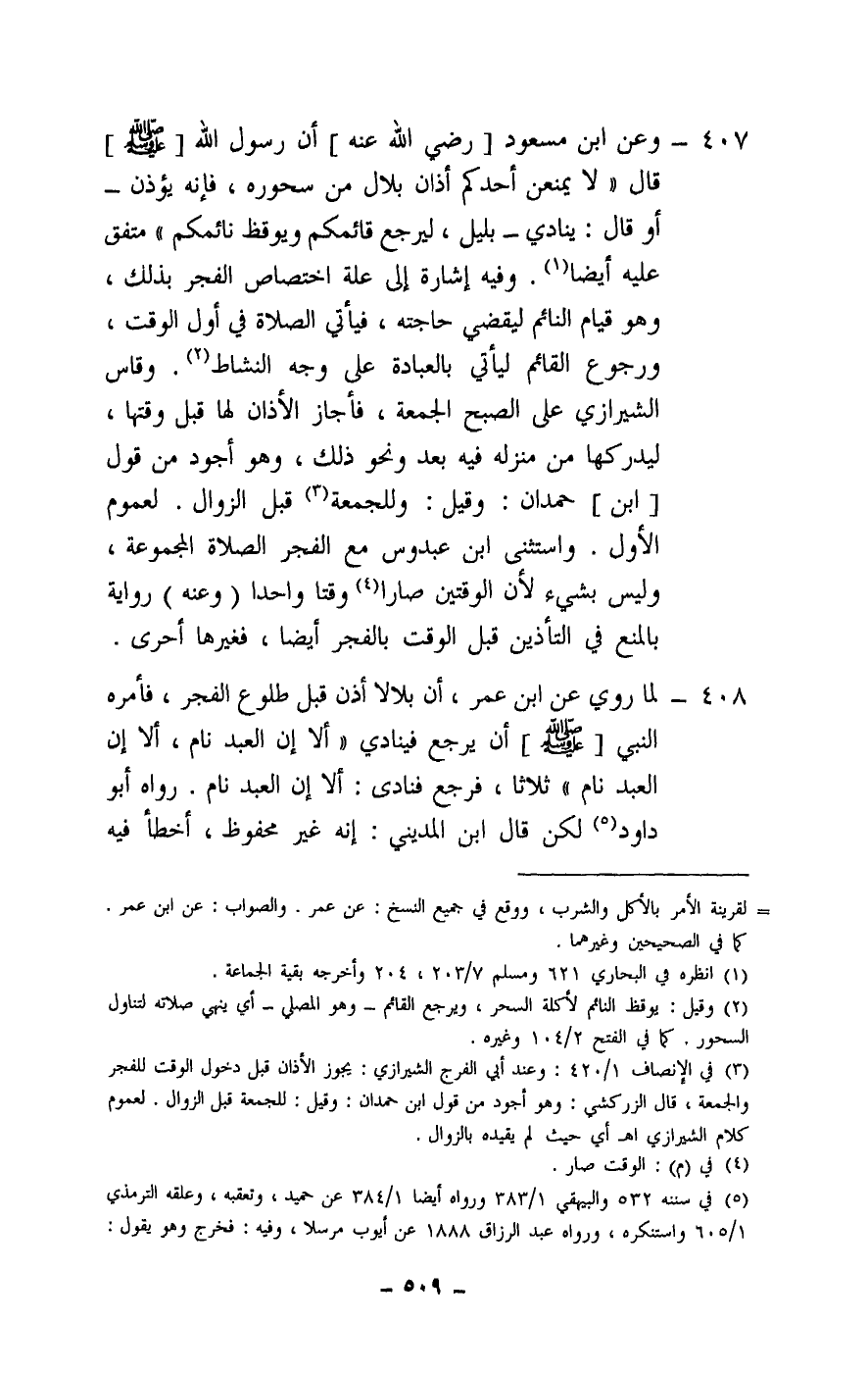 407 - وعن ابن مسعود [- رَضِيَ اللَّهُ عَنْهُ -] أن رسول الله - صَلَّى اللَّهُ عَلَيْهِ وَسَلَّمَ - قال: «لا يمنعن أحدكم أذان بلال من سحوره، فإنه يؤذن - أو قال: ينادي - بليل، ليرجع قائمكم ويوقظ نائمكم» متفق عليه أيضا. وفيه إشارة إلى علة اختصاص الفجر بذلك، وهو قيام النائم ليقضي حاجته، فيأتي الصلاة في أول الوقت، ورجوع القائم ليأتي بالعبادة على وجه النشاط.