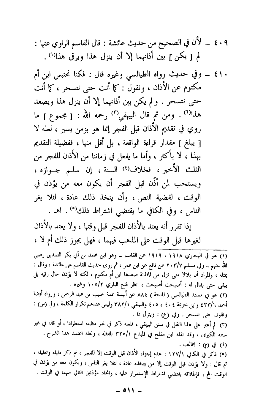 410 - وفي حديث رواه الطيالسي وغيره قال: «فكنا نحتبس ابن أم مكتوم عن الأذان، ونقول: كما أنت حتى نتسحر، كما أنت حتى نتسحر. ولم يكن بين أذانهم إلا أن ينزل هذا ويصعد هذا» . ومن ثم قال البيهقي - رَحِمَهُ اللَّهُ -: [مجموع] ما روي في تقديم الأذان قبل الفجر إنما هو بزمن يسير، لعله لا [يبلغ] مقدار قراءة الواقعة، بل أقل منها، ففضيلة التقديم بهذا، لا بأكثر، وأما ما يفعل في زماننا من الأذان للفجر من الثلث الأخير، فخلاف السنة، إن سلم جوازه، ويستحب لمن أذن قبل الفجر أن يكون معه من يؤذن في الوقت، لقضية النص، وأن يتخذ ذلك عادة، لئلا يغر الناس، وفي الكافي ما يقتضي اشتراط ذلك. اهـ.