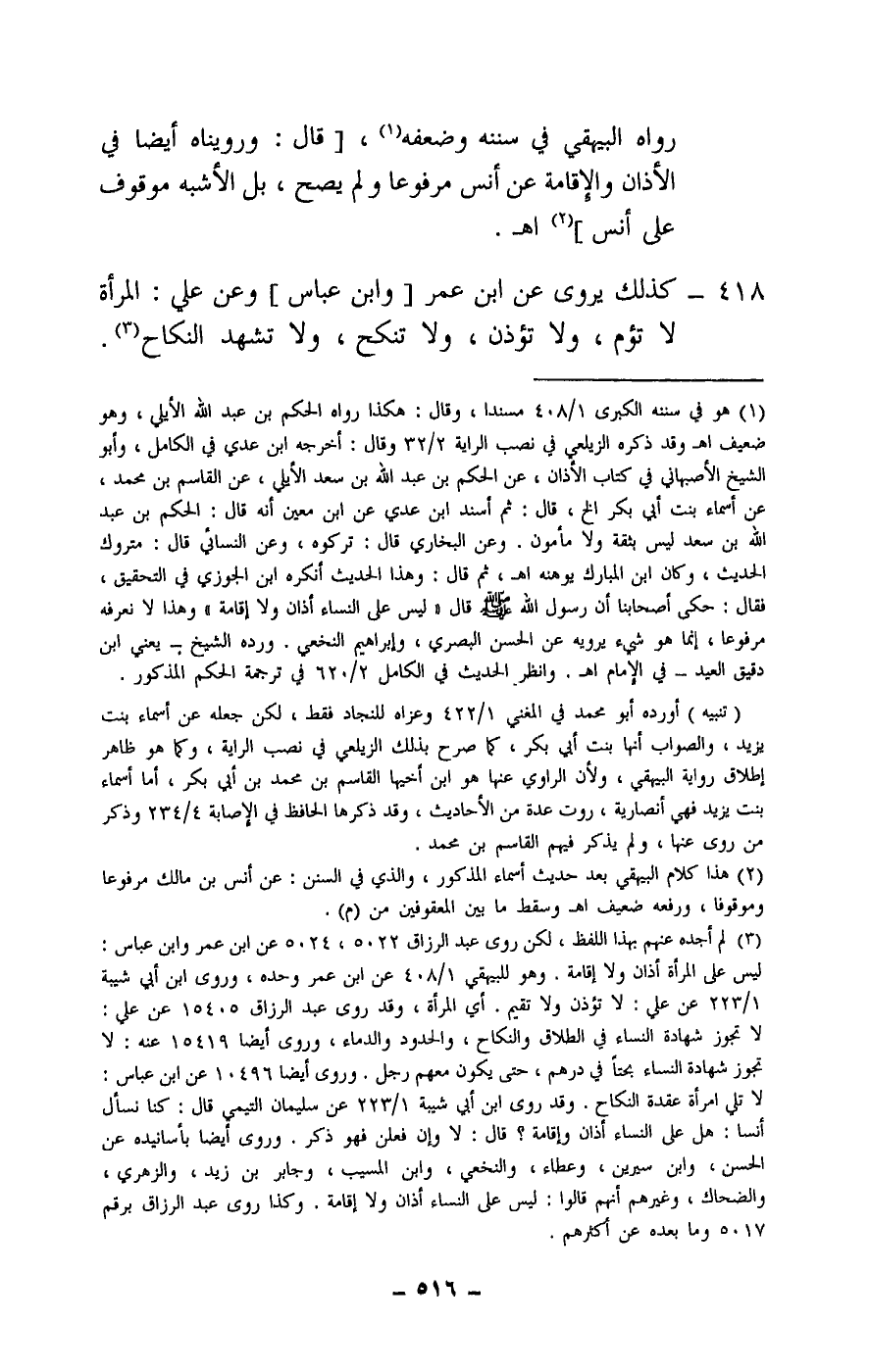 418 - كذلك يروى عن ابن عمر [وابن عباس] وعن علي: المرأة لا تؤم، ولا تؤذن، ولا تنكح، ولا تشهد النكاح.