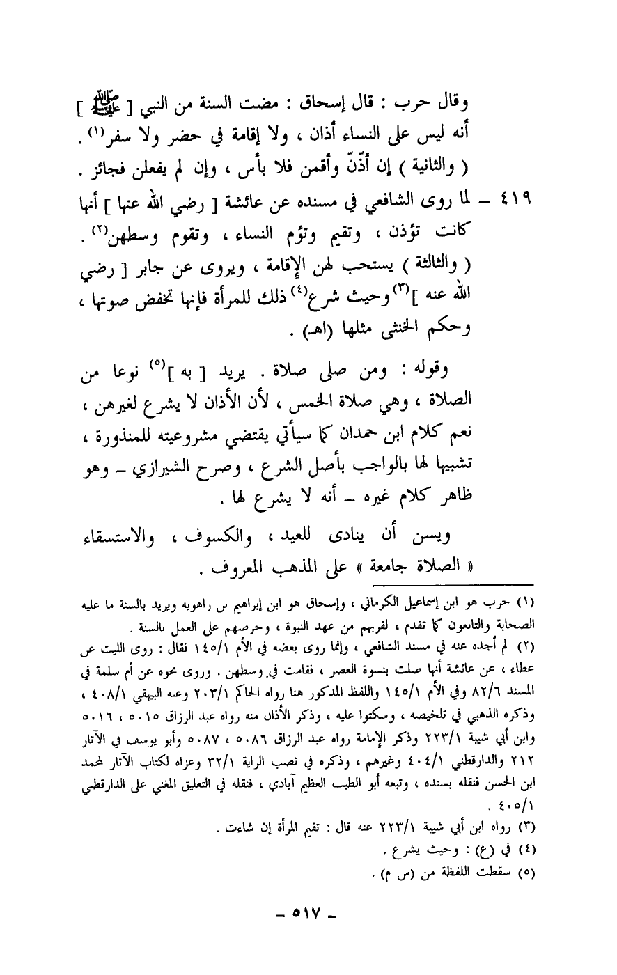 وقال حرب: قال إسحاق: مضت السنة من النبي - صَلَّى اللَّهُ عَلَيْهِ وَسَلَّمَ - أنه ليس على النساء أذان، ولا إقامة في حضر ولا سفر.