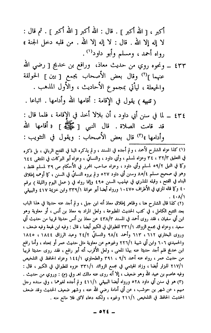 433 - ونحوه روي من حديث معاذ، ورافع بن خديج [- رَضِيَ اللَّهُ عَنْهُمَا -] وقال بعض الأصحاب يجمع [بين] الحولقة والحيعلة، ليأتي بمجموع الأحاديث، والأول المذهب.