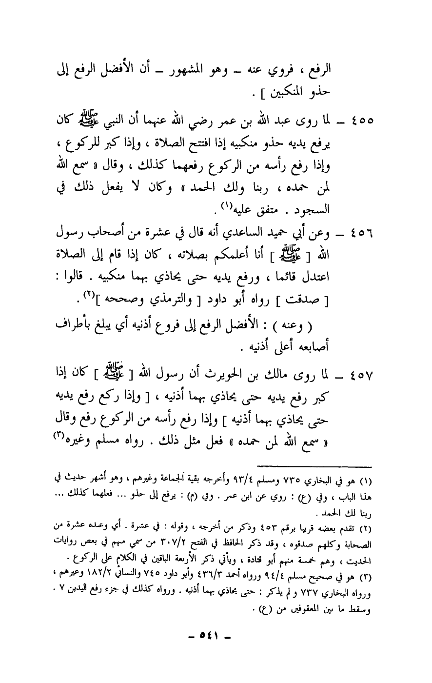 455 - لما روى عبد الله بن عمر - رَضِيَ اللَّهُ عَنْهُمَا - «أن النبي - صَلَّى اللَّهُ عَلَيْهِ وَسَلَّمَ - كان يرفع يديه حذو منكبيه إذا افتتح الصلاة، وإذا كبر للركوع، وإذا رفع رأسه من الركوع رفعهما كذلك، وقال: «سمع الله لمن حمده، ربنا ولك الحمد» وكان لا يفعل ذلك في السجود» . متفق عليه.