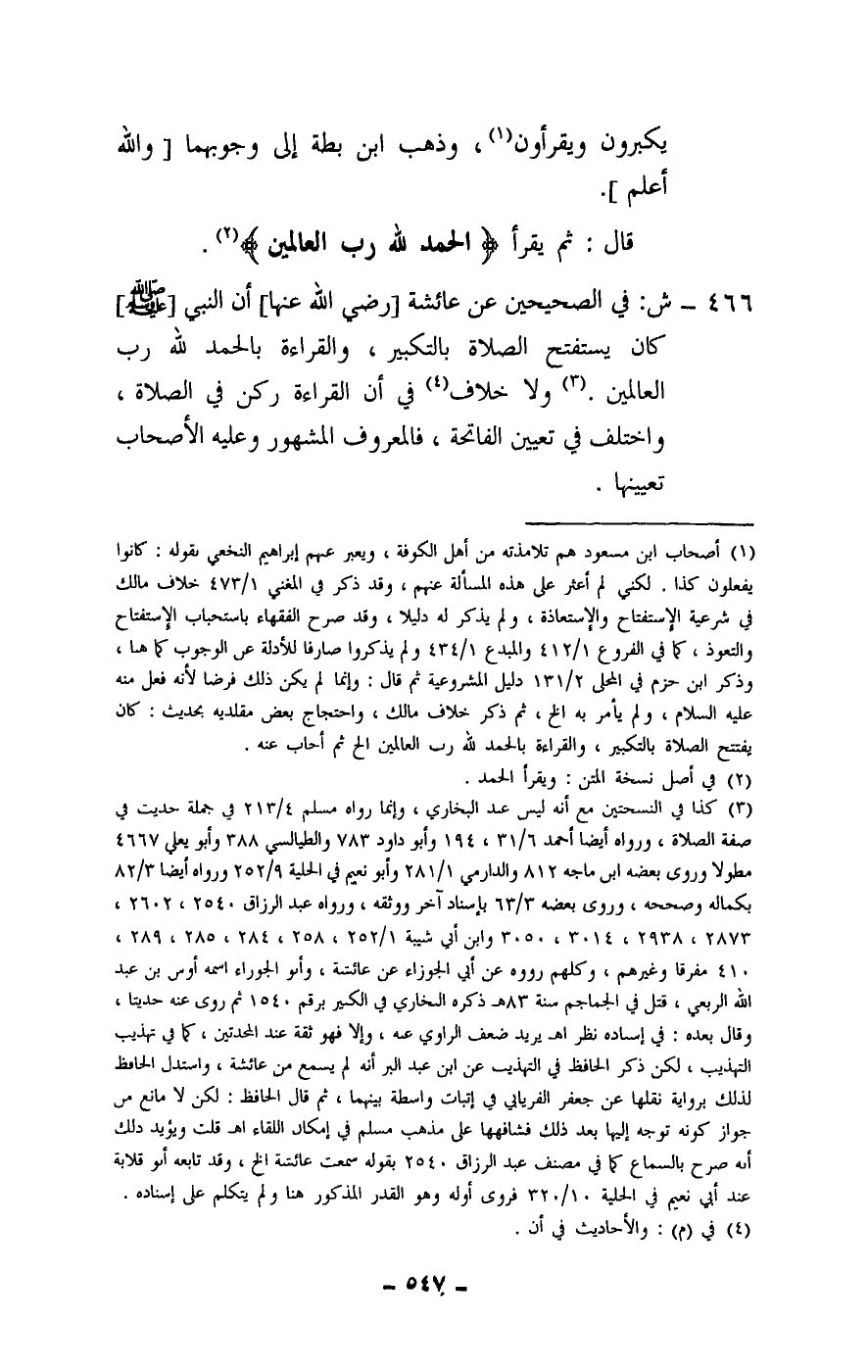 466 - ش: في الصحيحين عن عائشة [- رَضِيَ اللَّهُ عَنْهَا -] «أن النبي - صَلَّى اللَّهُ عَلَيْهِ وَسَلَّمَ - كان يستفتح الصلاة بالتكبير، والقراءة بالحمد لله رب العالمين» .