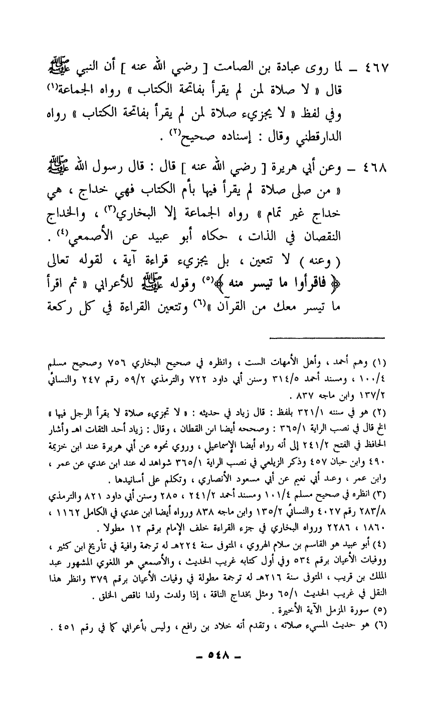 467 - لما روى عبادة بن الصامت [- رَضِيَ اللَّهُ عَنْهُ -] أن النبي - صَلَّى اللَّهُ عَلَيْهِ وَسَلَّمَ - قال: «لا صلاة لمن لم يقرأ بفاتحة الكتاب» . رواه الجماعة.