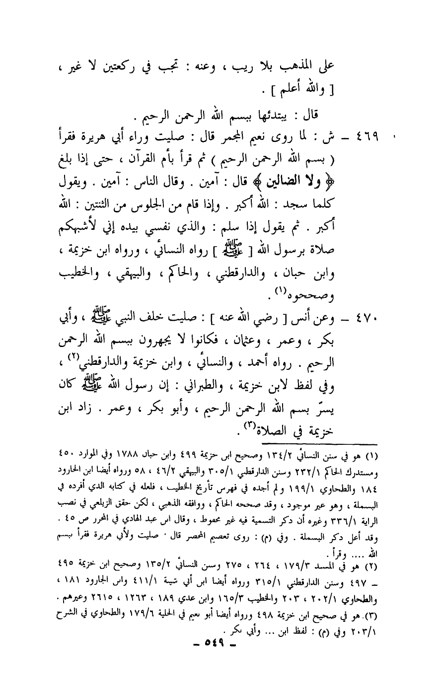 469 - ش: لما روى «نعيم المجمر قال: صليت وراء أبي هريرة فقرأ (بِسْمِ اللَّهِ الرَّحْمَنِ الرَّحِيمِ) ، ثم قرأ بأم القرآن، حتى إذا بلغ {وَلَا الضَّالِّينَ} [الفاتحة: 7] قال: آمين. وقال الناس: آمين. ويقول كلما سجد: الله أكبر، وإذا قام من الجلوس من الثنتين: الله أكبر. ثم يقول إذا سلم: والذي نفسي بيده، إني لأشبهكم صلاة برسول الله - صَلَّى اللَّهُ عَلَيْهِ وَسَلَّمَ -» . رواه النسائي، ورواه ابن خزيمة، وابن حبان، والدارقطني، والحاكم، والبيهقي، والخطيب، وصححوه.