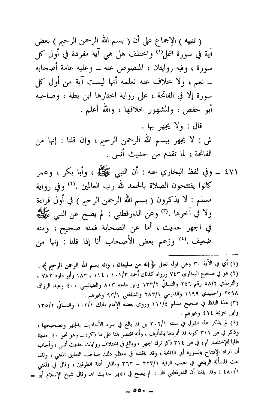 471 - وفي لفظ البخاري عنه: «أن النبي - صَلَّى اللَّهُ عَلَيْهِ وَسَلَّمَ - وأبا بكر، وعمر كانوا يفتتحون الصلاة بالحمد لله رب العالمين» . وفي رواية مسلم: لا يذكرون (بِسْمِ اللَّهِ الرَّحْمَنِ الرَّحِيمِ) في أول قراءة ولا في آخرها. وعن الدارقطني: لم يصح عن النبي - صَلَّى اللَّهُ عَلَيْهِ وَسَلَّمَ - في الجهر حديث، أما عن الصحابة فمنه صحيح، ومنه ضعيف.