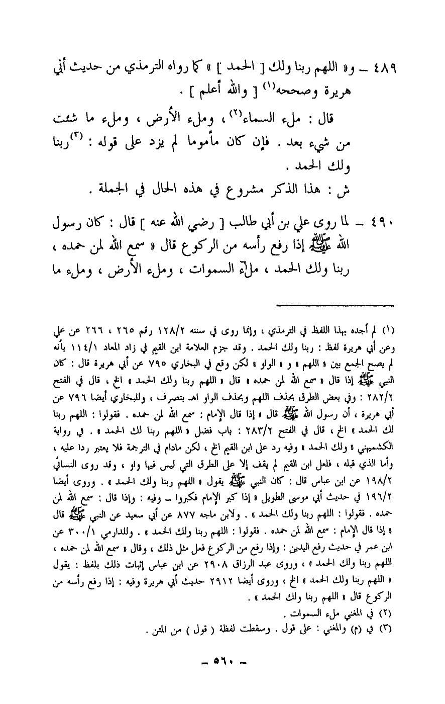 490 - لما روى علي بن أبي طالب [- رَضِيَ اللَّهُ عَنْهُ -] قال: «كان رسول الله - صَلَّى اللَّهُ عَلَيْهِ وَسَلَّمَ - إذا رفع رأسه من الركوع قال: «سمع الله لمن حمده، ربنا ولك الحمد، ملء السموات، وملء الأرض، وملء ما