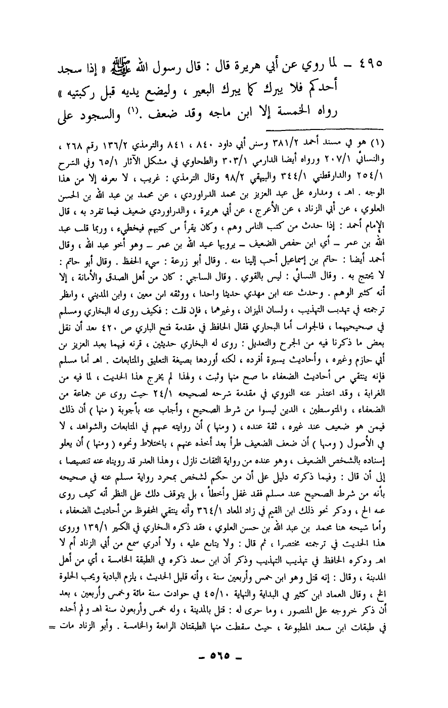 495 - لما روي عن أبي هريرة قال: قال رسول الله - صَلَّى اللَّهُ عَلَيْهِ وَسَلَّمَ -: «إذا سجد أحدكم فلا يبرك كما يبرك البعير، وليضع يديه قبل ركبتيه» . رواه الخمسة إلا ابن ماجه وقد ضعف. والسجود على