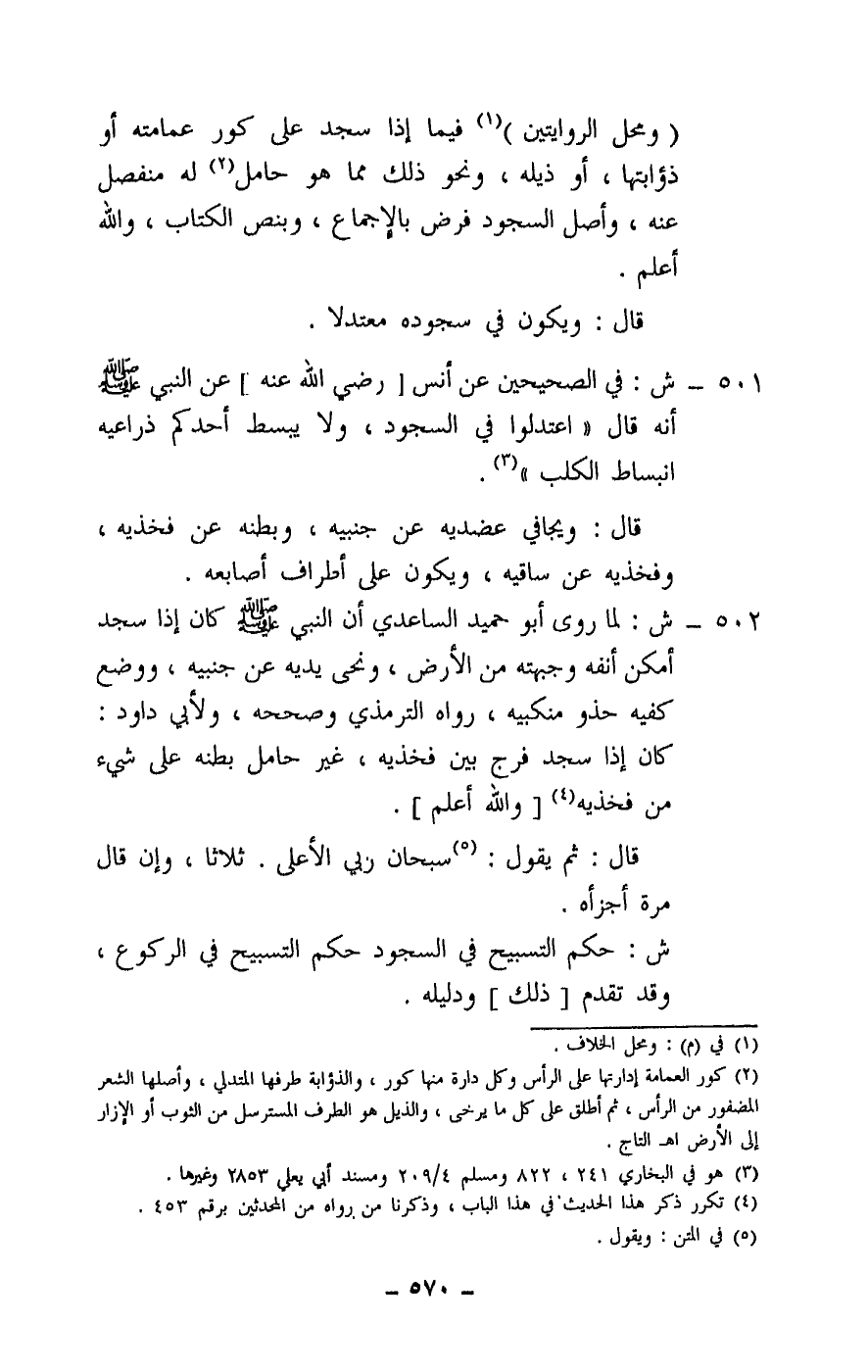 502 - ش: لما روى أبو حميد الساعدي «أن النبي - صَلَّى اللَّهُ عَلَيْهِ وَسَلَّمَ - كان إذا سجد أمكن أنفه وجبهته من الأرض، من الأرض، ونحى يديه عن جنبيه، ووضع كفيه حذو منكبيه» ، رواه الترمذي وصححه، ولأبي داود: كان إذا سجد فرج بين فخذيه، غير حامل بطنه على شيء من فخذيه، [والله أعلم] .
