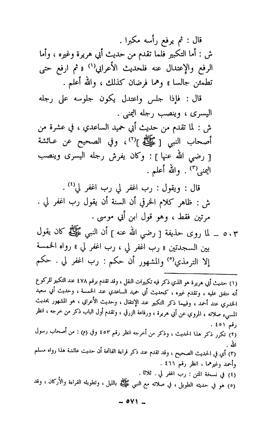 503 - لما روى حذيفة [- رَضِيَ اللَّهُ عَنْهُ -] أن النبي - صَلَّى اللَّهُ عَلَيْهِ وَسَلَّمَ - كان يقول بين السجدتين: «رب اغفر لي، رب اغفر لي» رواه الخمسة، إلا الترمذي، والمشهور أن حكم: رب اغفر لي، حكم