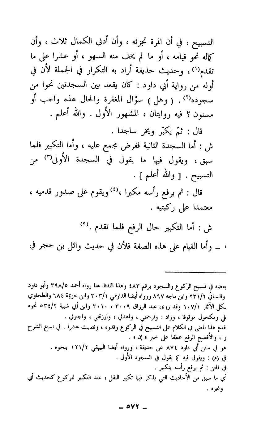 التسبيح، في أن المرة تجزئه، وأن أدنى الكمال ثلاث، وأن كماله نحو قيامه، أو ما لم يخف منه السهو، أو عشرا على ما تقدم، وحديث حذيفة أراد به التكرار في الجملة لأن في أوله من رواية أبي داود: كان يقعد بين السجدتين نحوا من سجوده.