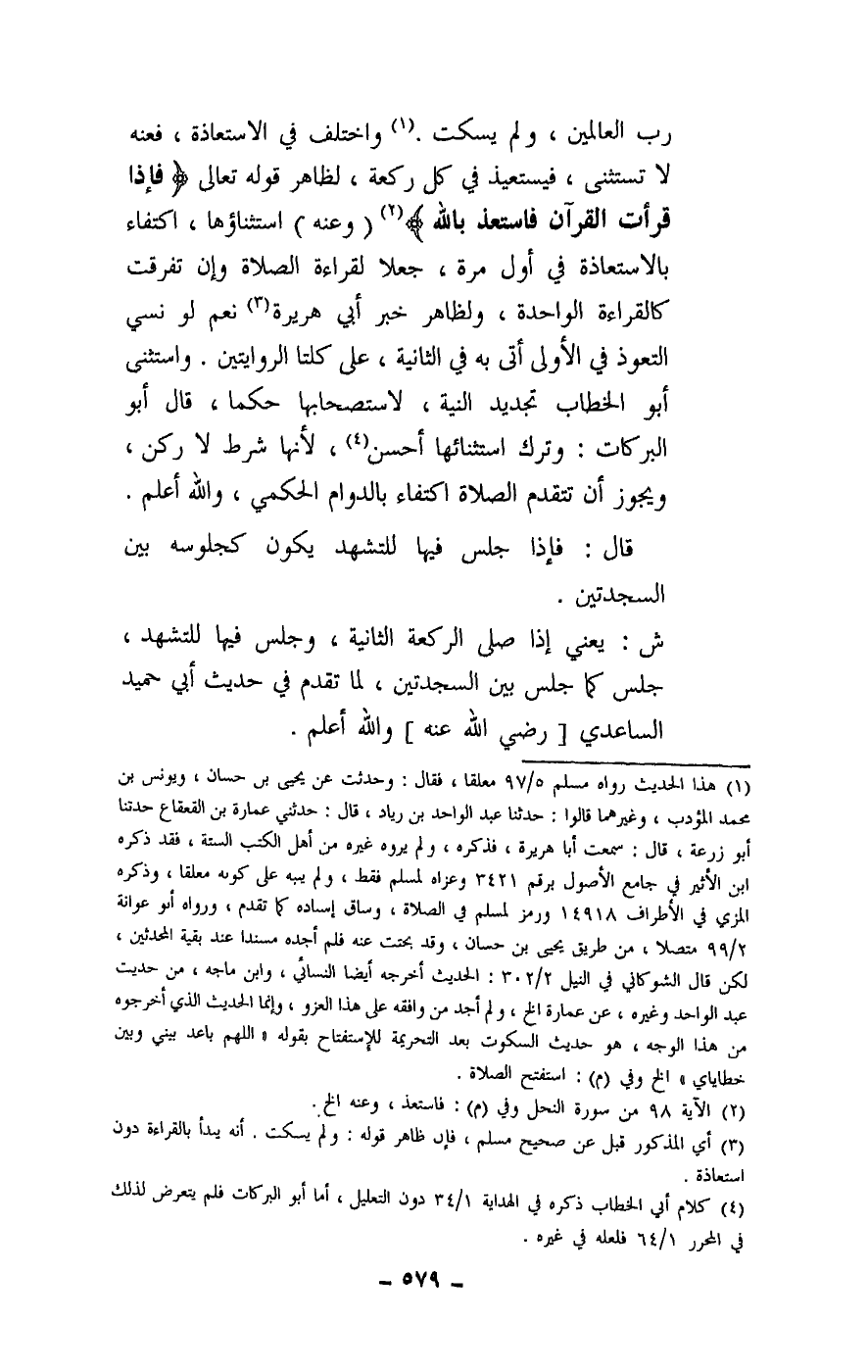 رب العالمين، ولم يسكت» . واختلف في الاستعاذة، فعنه: لا تستثنى، فيستعيذ في كل ركعة، لظاهر قَوْله تَعَالَى: {فَإِذَا قَرَأْتَ الْقُرْآنَ فَاسْتَعِذْ بِاللَّهِ} [النحل: 98]