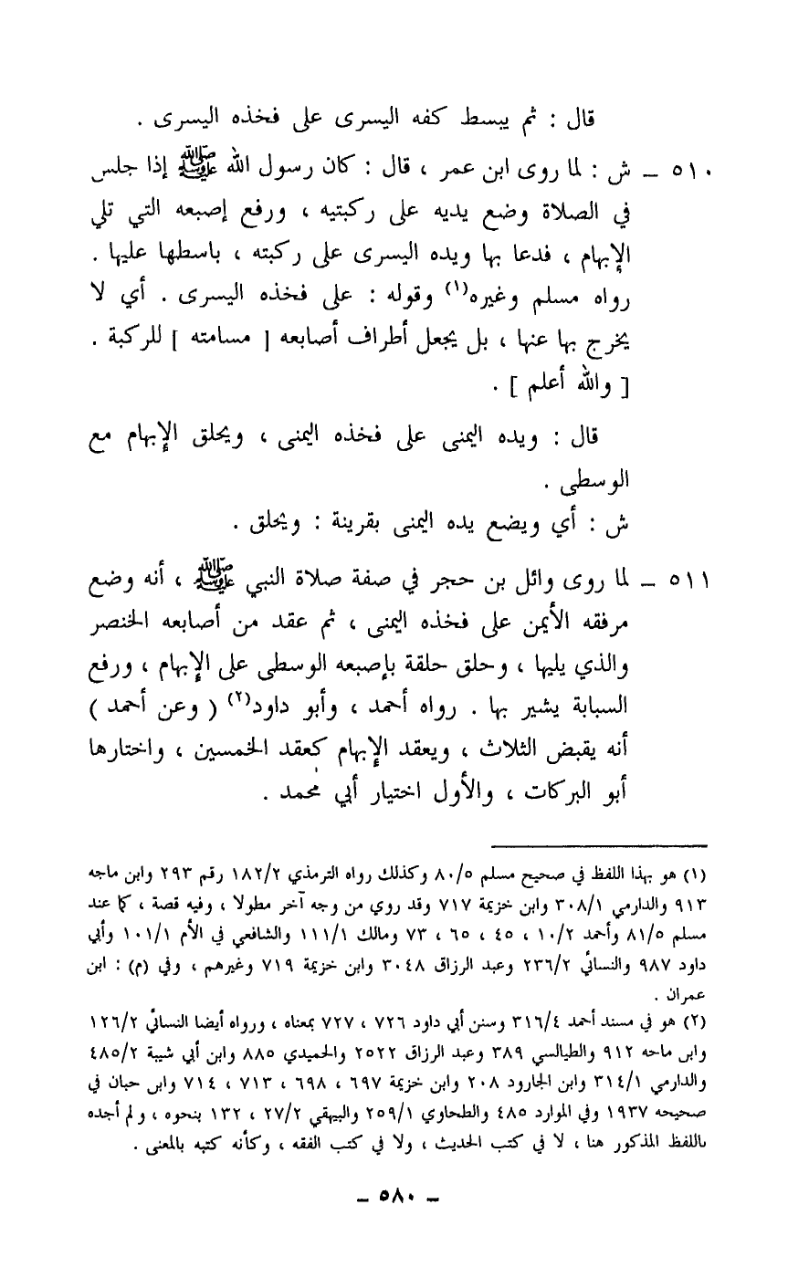511 - لما «روى وائل بن حجر في صفة صلاة النبي - صَلَّى اللَّهُ عَلَيْهِ وَسَلَّمَ - أنه وضع مرفقه الأيمن على فخذه اليمنى، ثم عقد من أصابعه الخنصر والذي يليها، وحلق حلقة بإصبعه الوسطى على الإبهام، ورفع السبابة يشير بها» . رواه أحمد، وأبو داود. (وعن أحمد) أنه يقبض الثلاث، ويعقد الإبهام كعقد الخمسين، واختارها أبو البركات، والأول اختيار أبي محمد.
