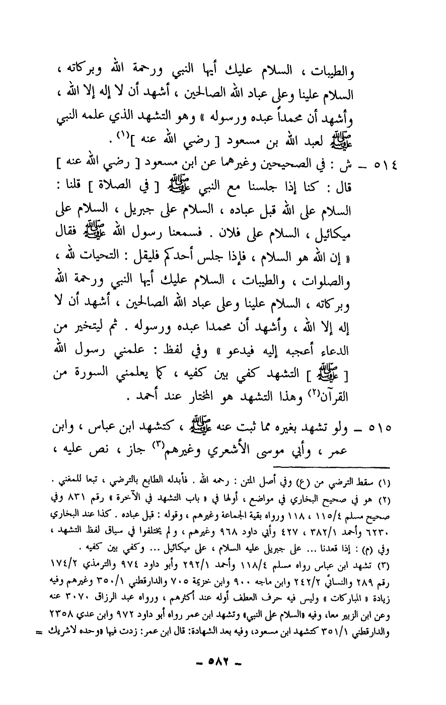 514 - ش: في الصحيحين وغيرهما عن ابن مسعود [- رَضِيَ اللَّهُ عَنْهُ -] قال: «كنا إذا جلسنا مع النبي - صَلَّى اللَّهُ عَلَيْهِ وَسَلَّمَ -[في الصلاة] قلنا: السلام على الله قبل عباده، السلام على جبريل، السلام على ميكائيل، السلام على فلان. فسمعنا رسول الله - صَلَّى اللَّهُ عَلَيْهِ وَسَلَّمَ - فقال: «إن الله هو السلام، فإذا جلس أحدكم فليقل: التحيات لله، والصلوات، والطيبات، السلام عليك أيها النبي ورحمة الله وبركاته، السلام علينا وعلى عباد الله الصالحين، أشهد أن لا إله إلا الله، وأشهد أن محمدا عبده ورسوله. ثم ليتخير من الدعاء أعجبه إليه فيدعو» .