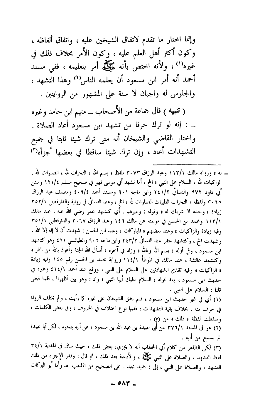 وإنما اختار ما تقدم لاتفاق الشيخين عليه، واتفاق ألفاظه، وكون أكثر أهل العلم عليه، وكون الأمر بخلاف ذلك في غيره، ولأنه اختص بأنه - صَلَّى اللَّهُ عَلَيْهِ وَسَلَّمَ - أمر بتعليمه، ففي مسند أحمد أنه أمر ابن مسعود أن يعلمه الناس وهذا التشهد، والجلوس لو واجبان لا سنة على المشهور من الروايتين.