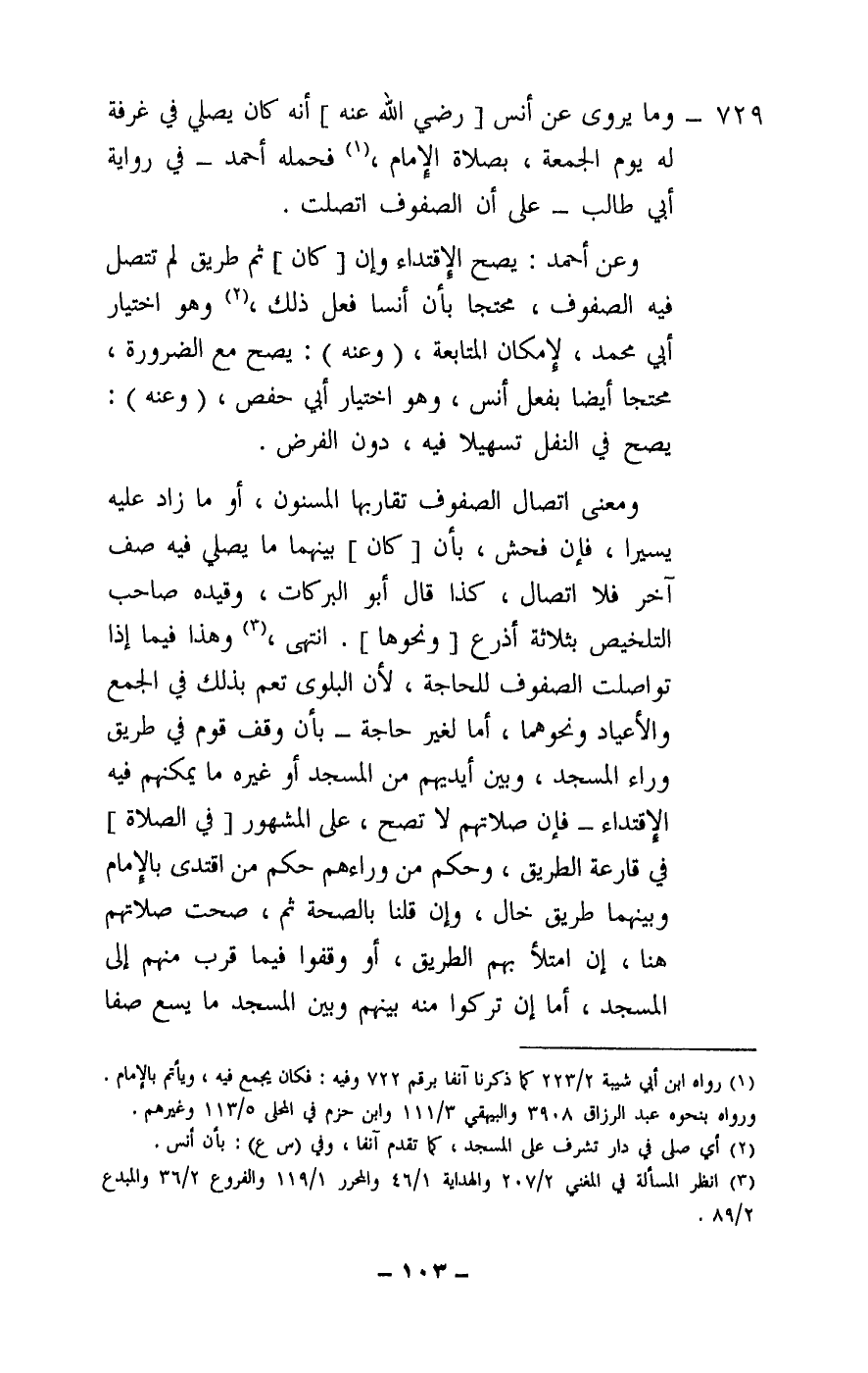 729 - وما يروى عن أنس [- رَضِيَ اللَّهُ عَنْهُ -] أنه كان يصلي في غرفة له يوم الجمعة، بصلاة الإمام، فحمله أحمد - في رواية أبي طالب - على أن الصفوف اتصلت.