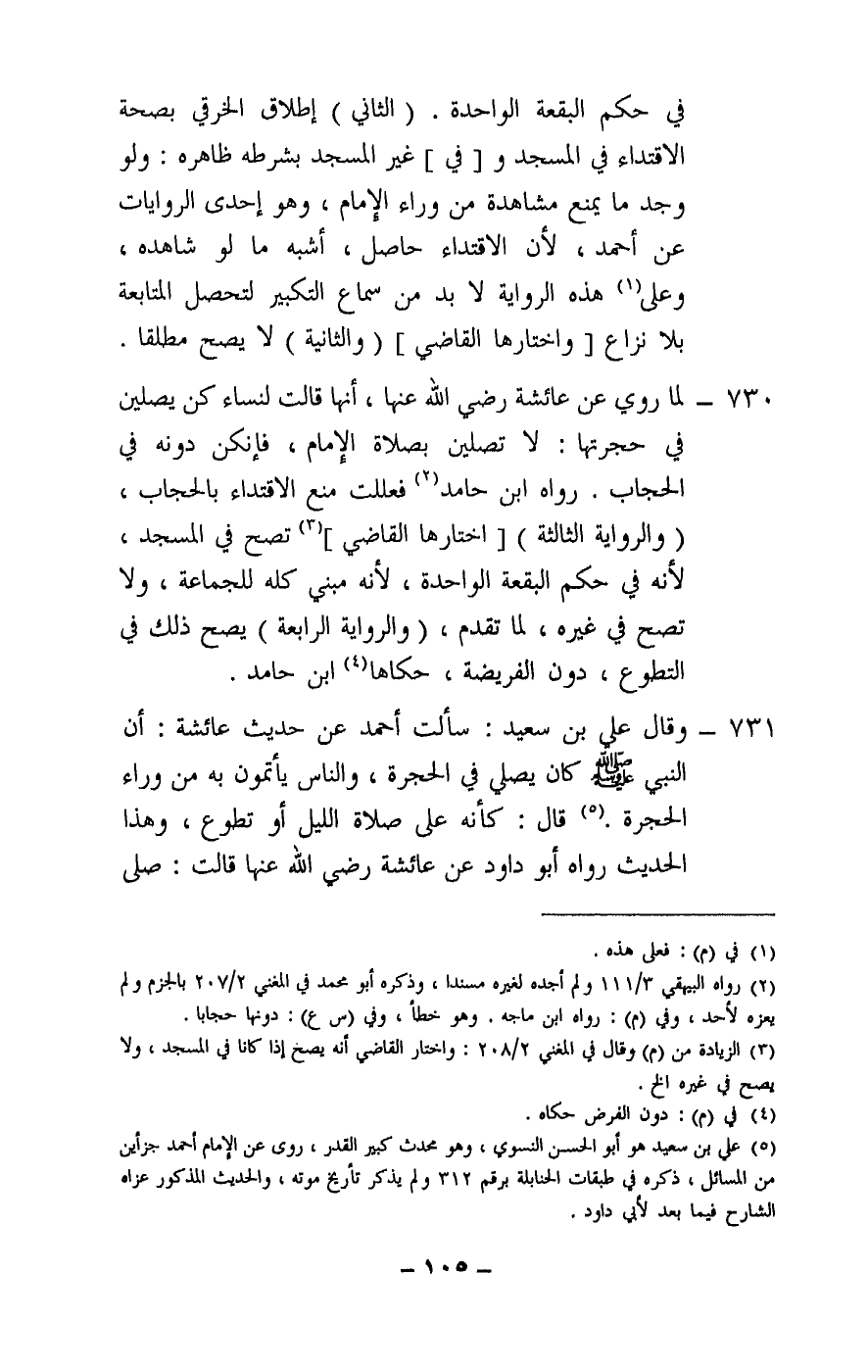 730 - لما روي عن عائشة - رَضِيَ اللَّهُ عَنْهَا -، أنها قالت لنساء كن يصلين في حجرتها: لا تصلين بصلاة الإمام، فإنكن دونه في الحجاب. رواه ابن حامد، فعللت منع الاقتداء بالحجاب، (والرواية الثالثة) [اختارها القاضي] تصح في المسجد، لأنه في حكم البقعة الواحدة، لأنه مبني كله للجماعة، ولا تصح في غيره، لما تقدم، (والرواية الرابعة) يصح ذلك في التطوع، دون الفريضة، حكاها ابن حامد.