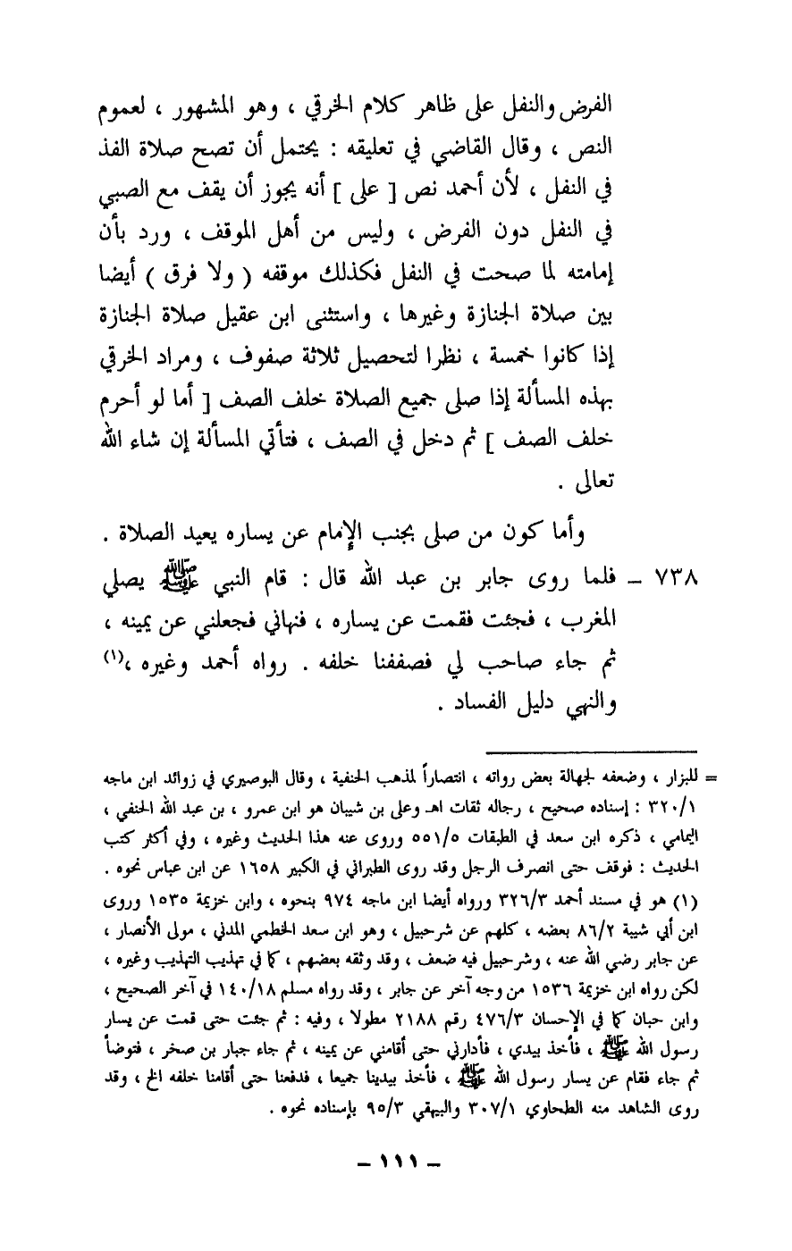 738 - فلما روى جابر بن عبد الله، قال: «قام النبي - صَلَّى اللَّهُ عَلَيْهِ وَسَلَّمَ - يصلي المغرب، فجئت فقمت عن يساره، فنهاني فجعلني عن يمينه، ثم جاء صاحب لي فصففنا خلفه» . رواه أحمد وغيره، والنهي دليل الفساد.