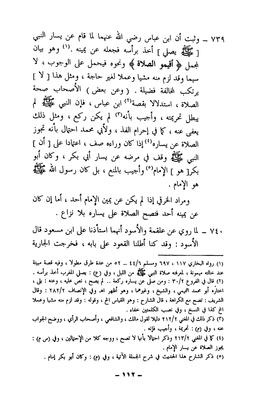 739 - وثبت «أن ابن عباس - رَضِيَ اللَّهُ عَنْهُمَا - لما قام عن يسار النبي [- صَلَّى اللَّهُ عَلَيْهِ وَسَلَّمَ - يصلي] أخذ برأسه فجعله عن يمينه» . وهو بيان لمجمل {أَقِيمُوا الصَّلَاةَ} [الأنعام: 72] ونحوه فيحمل على الوجوب، لا سيما وقد لزم منه مشيا وعملا لغير حاجة، ومثل هذا [لا] يرتكب لمخالفة فضيلة. (وعن بعض) الأصحاب صحة الصلاة، استدلالا بقصة ابن عباس، فإن النبي - صَلَّى اللَّهُ عَلَيْهِ وَسَلَّمَ - لم يبطل تحريمته، وأجيب بأنه لم يكن ركع، ومثل ذلك يعفى عنه، كما في إحرام الفذ، ولأبي محمد احتمال بأنه تجوز الصلاة عن يساره إذا كان وراءه صف، اعتمادا على « [أن] النبي - صَلَّى اللَّهُ عَلَيْهِ وَسَلَّمَ - وقف في مرضه عن يسار أبي بكر، وكان أبو بكر [وهو] الإمام» ، وأجيب بالمنع، بل كان رسول الله - صَلَّى اللَّهُ عَلَيْهِ وَسَلَّمَ - هو الإمام.