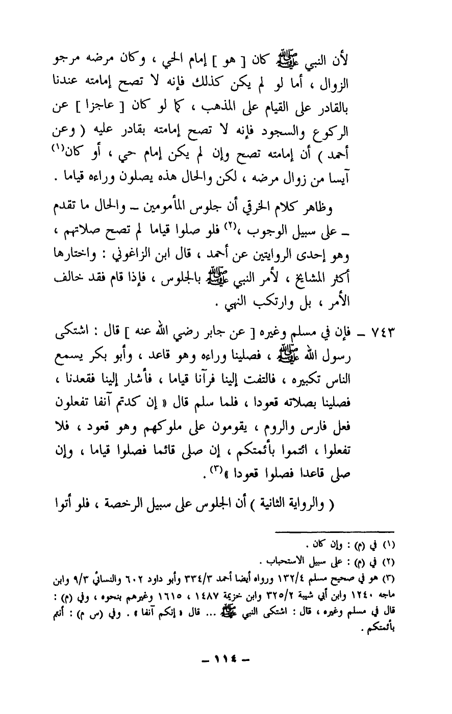 743 - فإن في مسلم وغيره [عن جابر - رَضِيَ اللَّهُ عَنْهُ -] قال: «اشتكى رسول الله - صَلَّى اللَّهُ عَلَيْهِ وَسَلَّمَ - فصلينا وراءه وهو قاعد، وأبو بكر يسمع الناس تكبيره، فالتفت إلينا فرآنا قياما، فأشار إلينا فقعدنا، فصلينا بصلاته قعودا، فلما سلم قال: «إن كدتم آنفا تفعلون فعل فارس والروم، يقومون على ملوكهم وهو قعود، فلا تفعلوا، ائتموا بأئمتكم، إن صلى قائما فصلوا قياما، وإن صلى قاعدا فصلوا قعودا» .