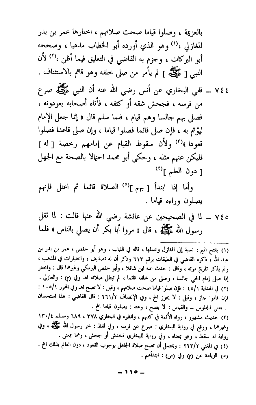 744 - ففي البخاري، عن أنس - رَضِيَ اللَّهُ عَنْهُ -، «أن النبي - صَلَّى اللَّهُ عَلَيْهِ وَسَلَّمَ - صرع من فرسه، فجحش شقه أو كتفه، فأتاه أصحابه يعودونه، فصلى بهم جالسا وهم قيام، فلما سلم قال: «إنما جعل الإمام ليؤتم به، فإن صلى قائما فصلوا قياما، وإن صلى قاعدا فصلوا قعودا» ولأن سقوط القيام عن إمامهم رخصة [له] فليكن عنهم مثله، وحكى أبو محمد احتمالا بالصحة مع الجهل [دون العلم] .