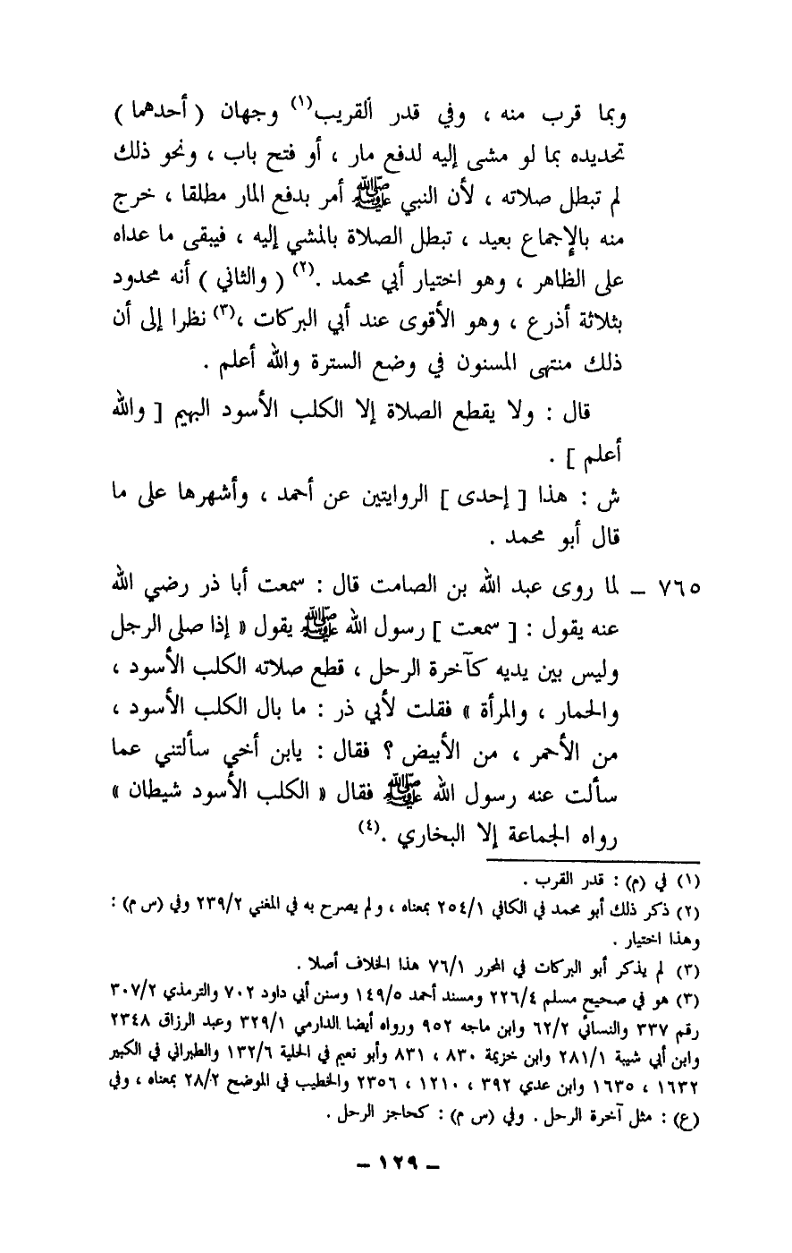 765 - لما «روى عبد الله بن الصامت قال: سمعت أبا ذر - رَضِيَ اللَّهُ عَنْهُ - يقول: [سمعت] رسول الله - صَلَّى اللَّهُ عَلَيْهِ وَسَلَّمَ - يقول: «إذا صلى الرجل وليس بين يديه كآخرة الرحل، قطع صلاته الكلب الأسود، والحمار، والمرأة» فقلت لأبي ذر: ما بال الكلب الأسود، من الأحمر، من الأبيض؟ فقال: يابن أخي سألتني عما سألت عنه رسول الله - صَلَّى اللَّهُ عَلَيْهِ وَسَلَّمَ - فقال: «الكلب الأسود شيطان» رواه الجماعة إلا البخاري.