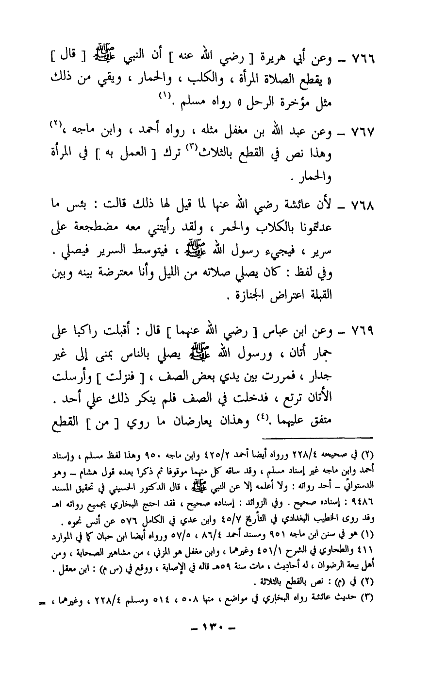 769 - «وعن ابن عباس [- رَضِيَ اللَّهُ عَنْهُمَا -] قال: أقبلت راكبا على حمار أتان، ورسول الله - صَلَّى اللَّهُ عَلَيْهِ وَسَلَّمَ - يصلي بالناس بمنى إلى غير جدار، فمررت بين يدي بعض الصف، [فنزلت] وأرسلت الأتان ترتع، فدخلت في الصف فلم ينكر ذلك علي أحد» . متفق عليهما. وهذان يعارضان ما روي [من] القطع