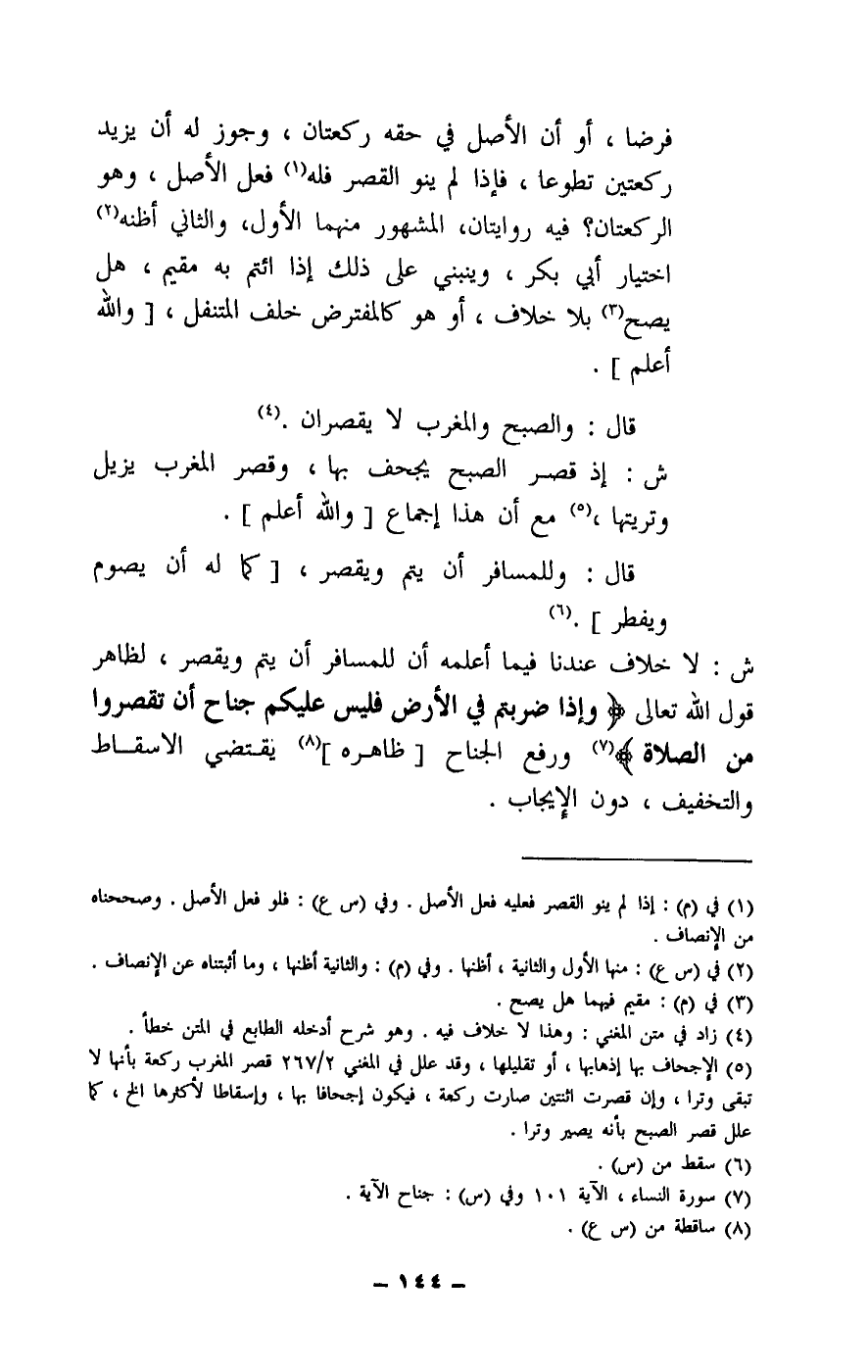 ش: لا خلاف عندنا فيما أعلمه أن للمسافر أن يتم ويقصر، لظاهر قول الله تعالى: {وَإِذَا ضَرَبْتُمْ فِي الْأَرْضِ فَلَيْسَ عَلَيْكُمْ جُنَاحٌ أَنْ تَقْصُرُوا مِنَ الصَّلَاةِ} [النساء: 101] ورفع الجناح [ظاهره] يقتضي الإسقاط والتخفيف، دون الإيجاب.