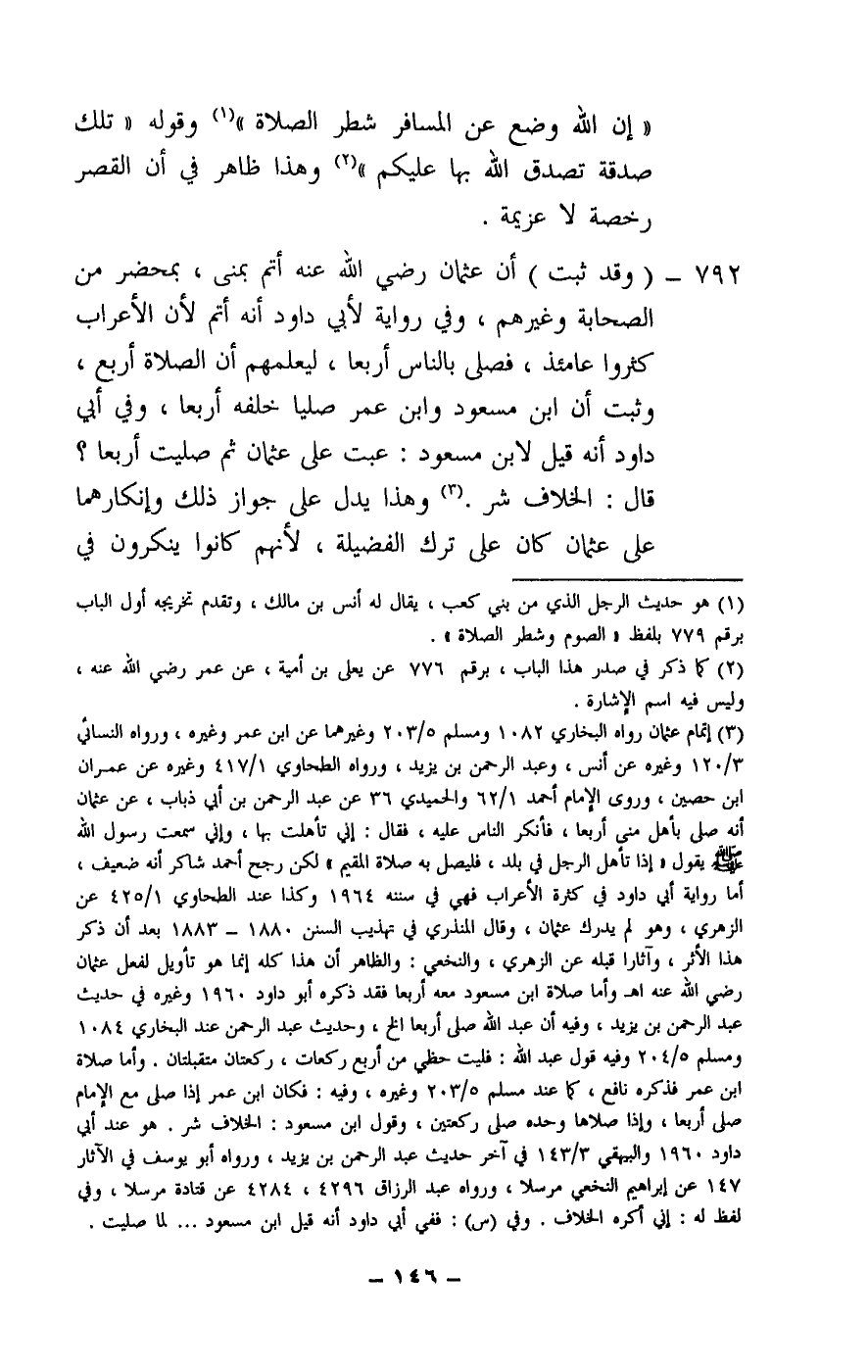 792 - (وقد ثبت) أن عثمان - رَضِيَ اللَّهُ عَنْهُ - أتم بمنى، بمحضر من الصحابة وغيرهم، وفي رواية لأبي داود أنه أتم لأن الأعراب كثروا عامئذ، فصلى بالناس أربعا، ليعلمهم أن الصلاة أربع، وثبت أن ابن مسعود وابن عمر صليا خلفه أربعا، وفي أبي داود أنه قيل لابن مسعود: عبت على عثمان ثم صليت أربعا؟ قال: الخلاف شر. وهذا يدل على جواز ذلك وإنكارهما على عثمان كان على ترك الفضيلة، لأنهم كانوا ينكرون في