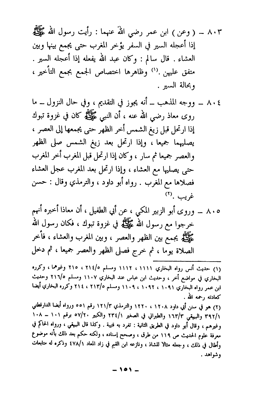 803 - ( «وعن) ابن عمر - رَضِيَ اللَّهُ عَنْهُمَا -: رأيت رسول الله - صَلَّى اللَّهُ عَلَيْهِ وَسَلَّمَ - إذا أعجله السير في السفر يؤخر المغرب حتى يجمع بينها وبين العشاء. قال سالم: وكان عبد الله يفعله إذا أعجله السير» . متفق عليهن. وظاهرها اختصاص الجمع بجمع التأخير، وبحالة السير.