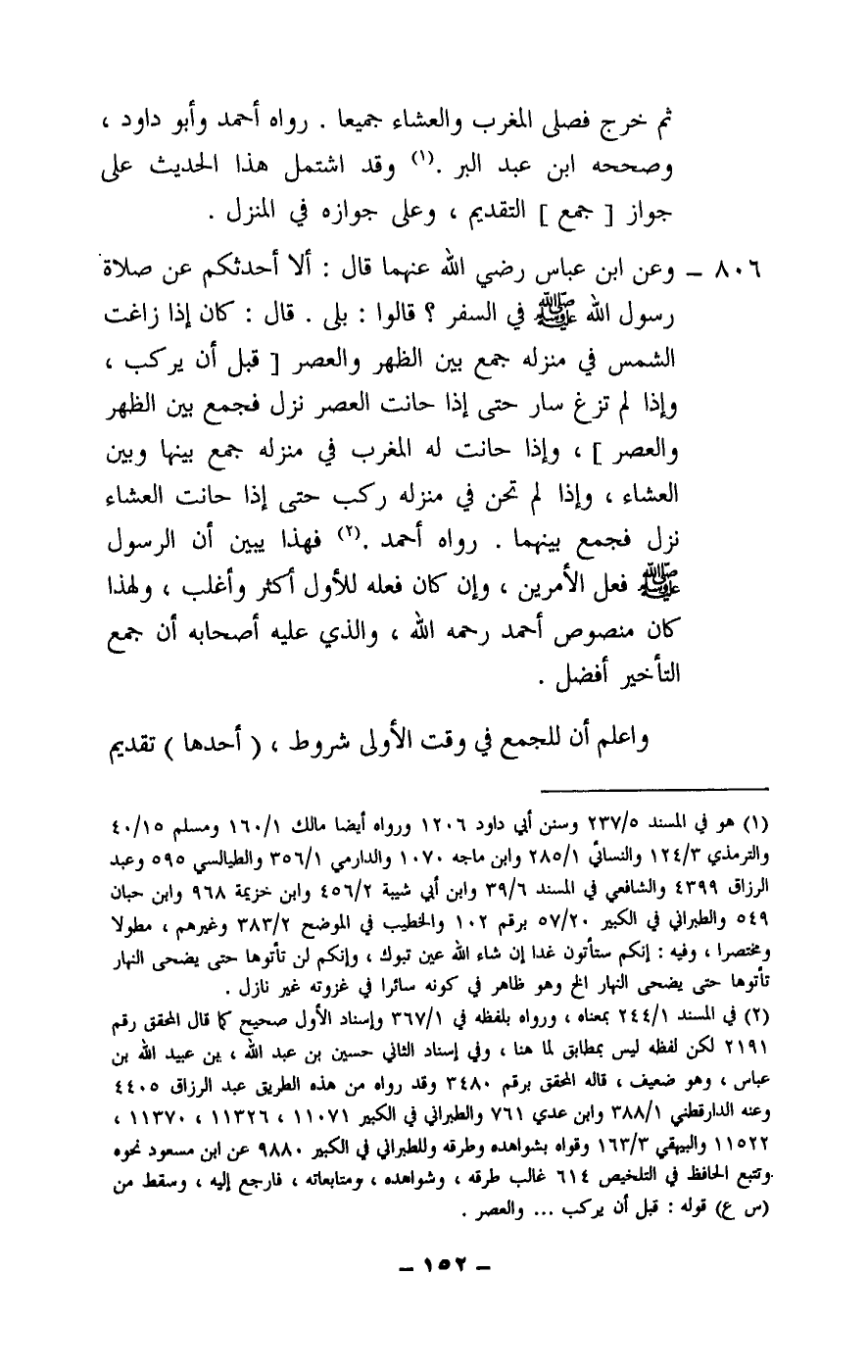 806 - «وعن ابن عباس - رَضِيَ اللَّهُ عَنْهُمَا - قال: ألا أحدثكم عن صلاة رسول الله - صَلَّى اللَّهُ عَلَيْهِ وَسَلَّمَ - في السفر؟ قالوا: بلى. قال: كان إذا زاغت الشمس في منزله جمع بين الظهر والعصر [قبل أن يركب، وإذا لم تزغ سار حتى إذا حانت العصر نزل فجمع بين الظهر والعصر] ، وإذا حانت له المغرب في منزله جمع بينها وبين العشاء، وإذا لم تحن في منزله ركب حتى إذا حانت العشاء نزل فجمع بينهما» . رواه أحمد فهذا يبين أن الرسول - صَلَّى اللَّهُ عَلَيْهِ وَسَلَّمَ - فعل الأمرين، وإن كان فعله للأول أكثر وأغلب، ولهذا كان منصوص أحمد - رَحِمَهُ اللَّهُ - والذي عليه أصحابه أن جمع التأخير أفضل.